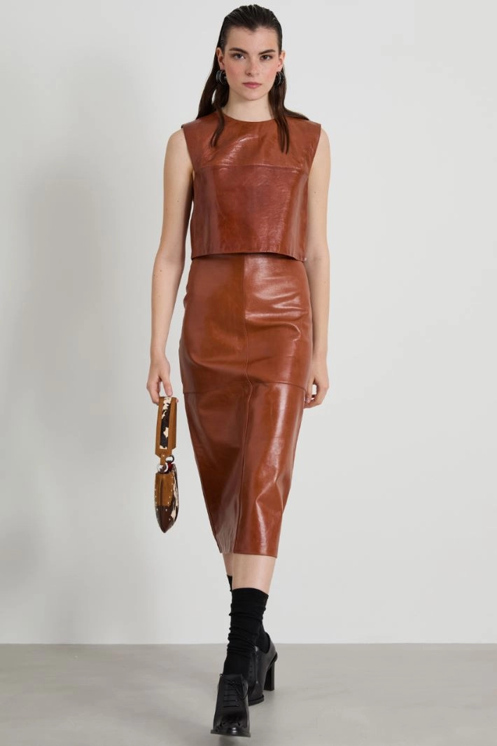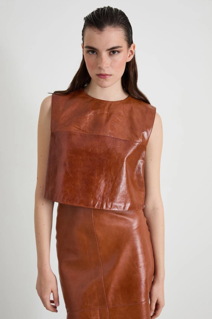 Straight-cut crop top in genuine nappa leather with an aged finish, with a crew neck, sleeveless and invisible zip fastening on the back.