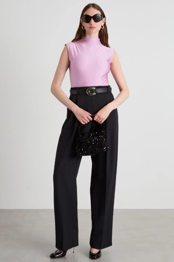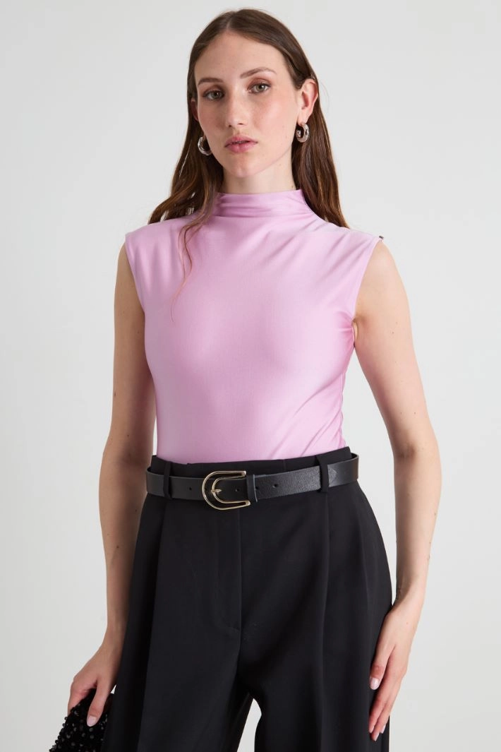 Fitted bodysuit in shiny jersey, with a raised neck and invisible zip fastening on the back.