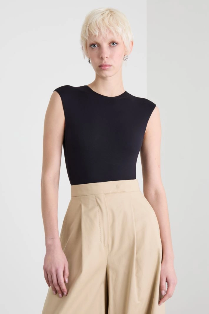 Tight-fitting bodysuit in stretch jersey, with round neckline, sleeveless and button fastening.