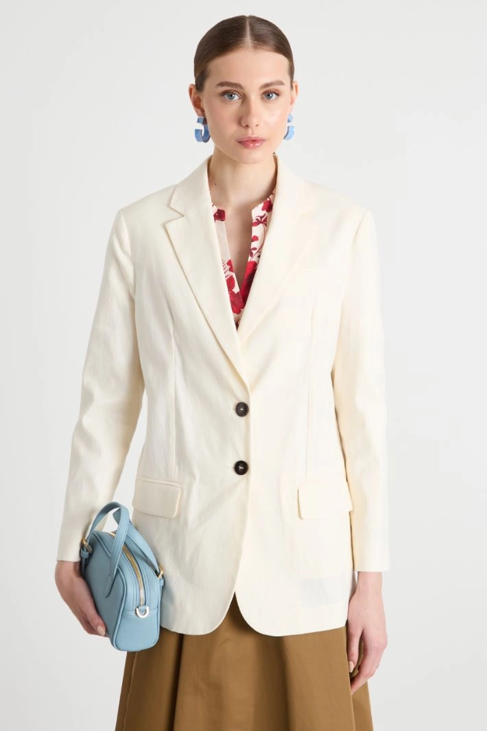 Straight-fit blazer crafted in stretch cotton and linen blend basketweave, featuring a lapel collar, long sleeves and flap pockets. Partially lined. Button fastening.