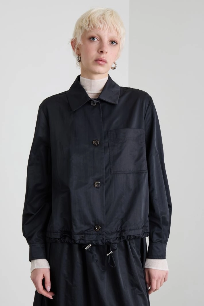 Satin boxy jacket with shirt collar, long sleeves with cuff and button, breast pocket and adjustable drawstring detail at the bottom of the garment. Single-breasted fastening with buttons. Unlined.
