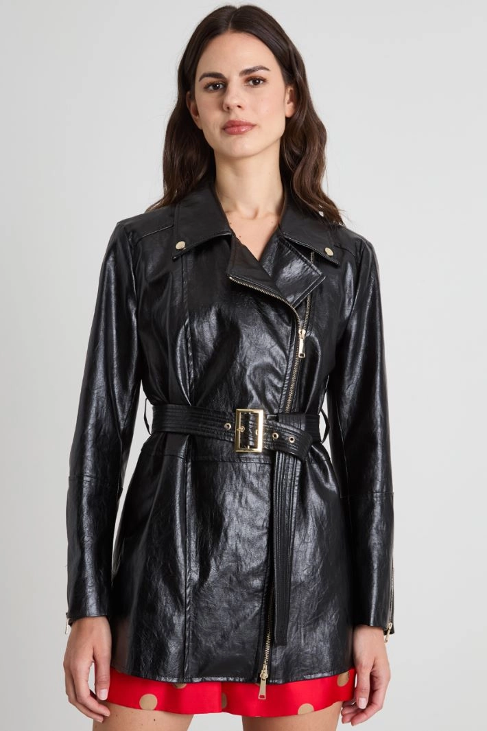 Straight-fit biker jacket in faux leather with a glossy, aged finish, featuring a shirt collar, long zipped sleeves, inset side pockets and asymmetrical zip fastening. Matching belt. Lined.