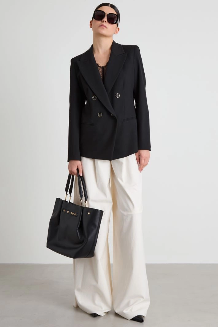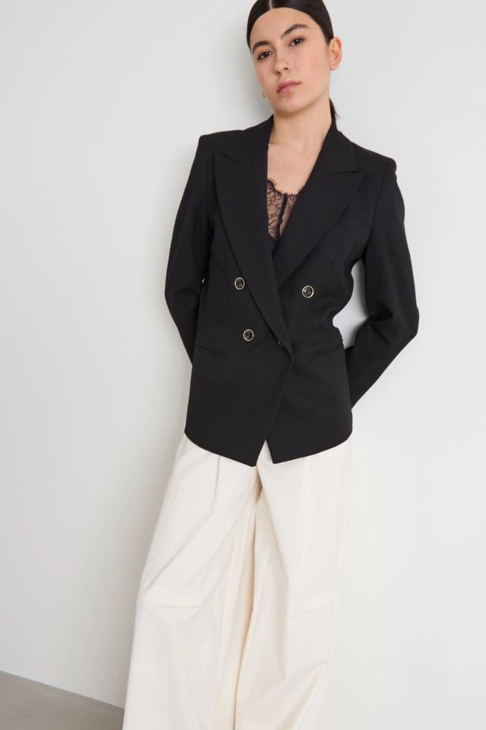 Fitted blazer in stretch viscose-blend gabardine, with peak lapel, long sleeves with buttons and double-welt pockets. Double-breasted button fastening. Lined.