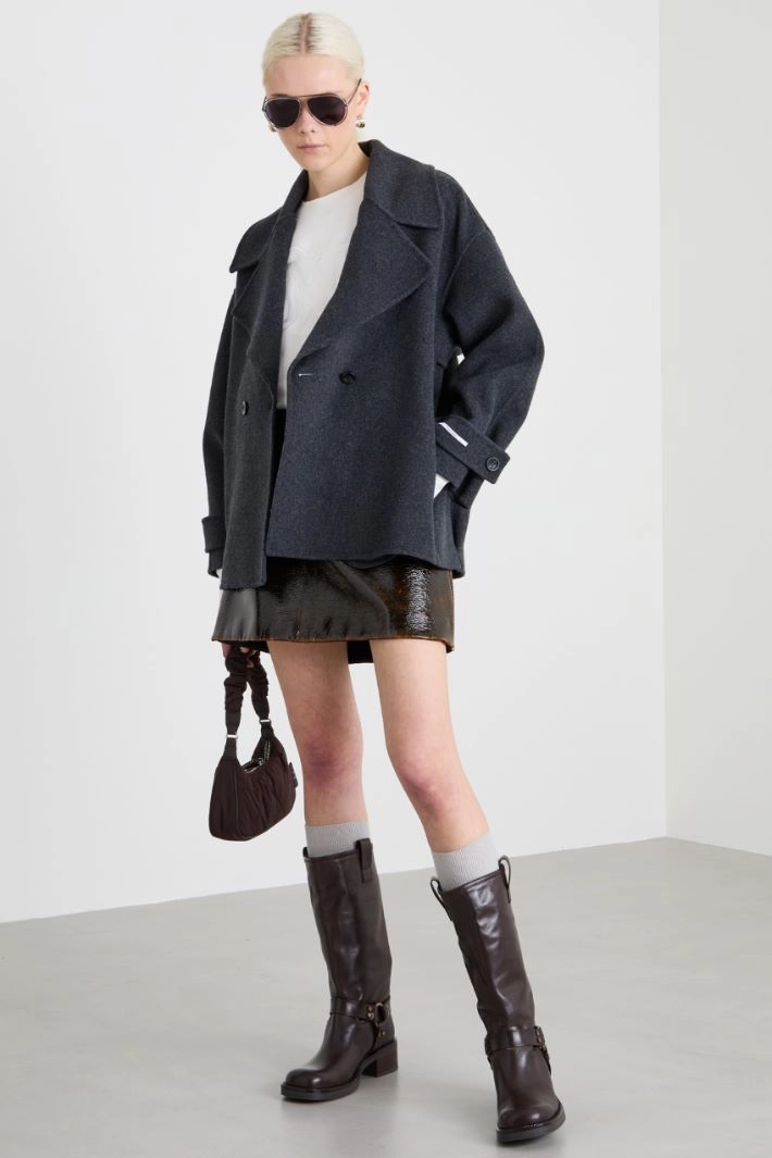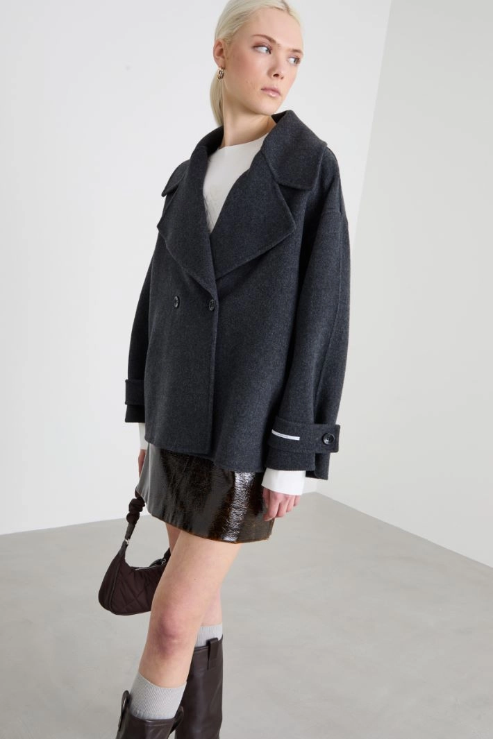 Straight-fit pea coat in double pure wool, with lapel collar, long dropped sleeves with wrist strap and inset side pockets. Double-breasted fastening with buttons. Unlined.