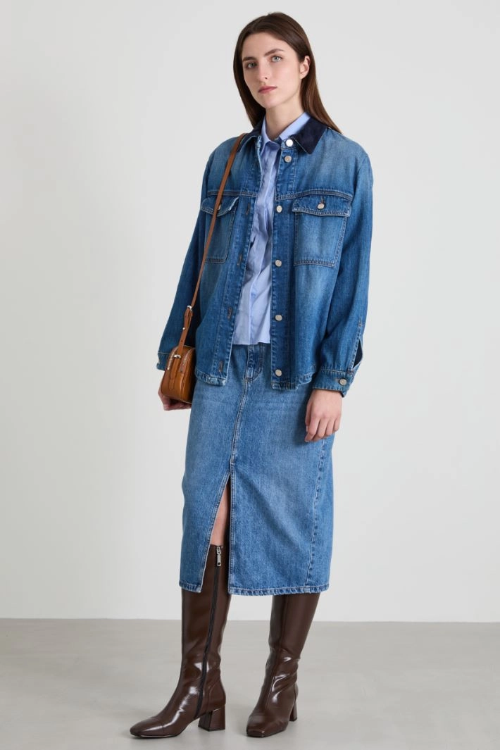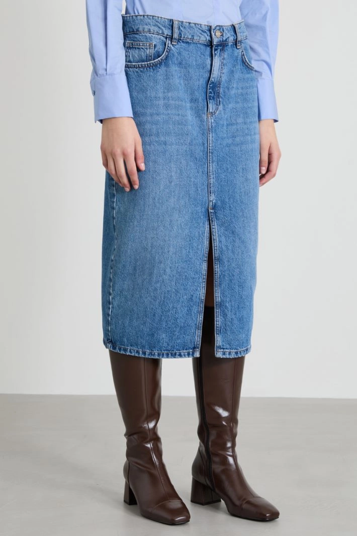 Straight-cut pure cotton denim skirt with belt loops, five pockets and a slit on the center front. Fastening with a hidden zip and metal button.