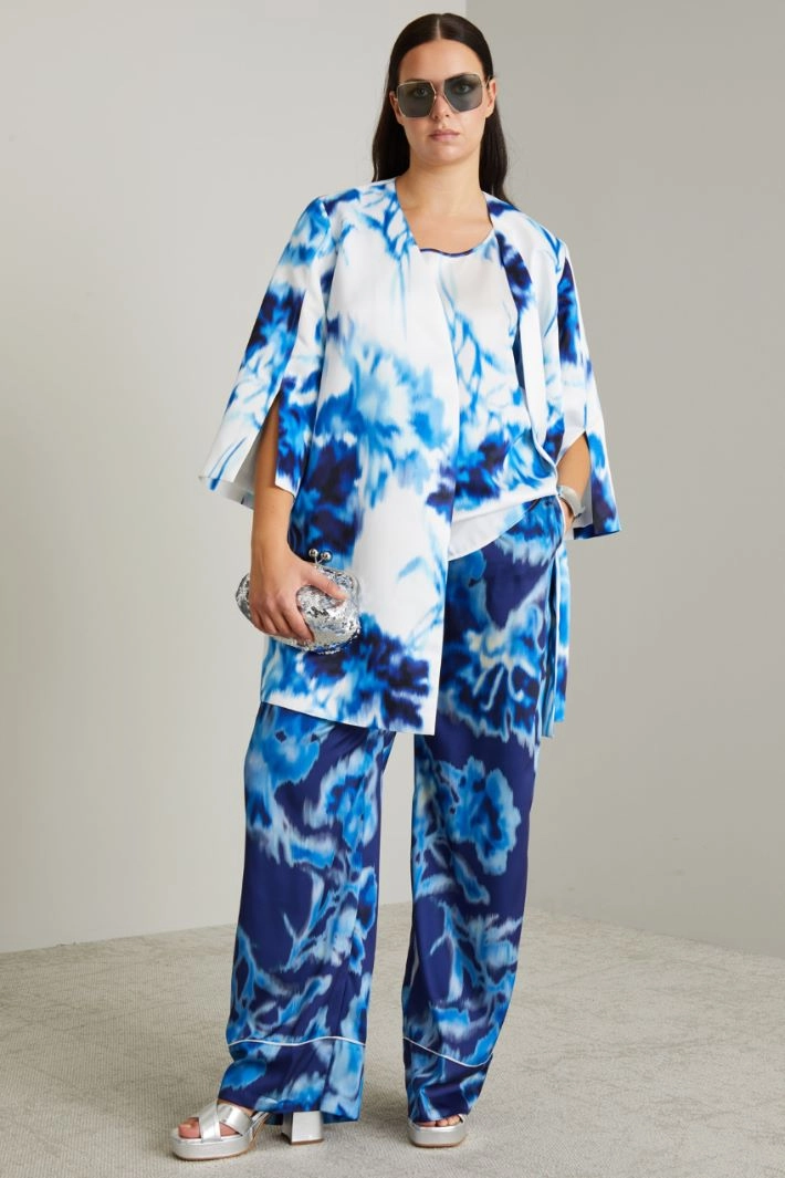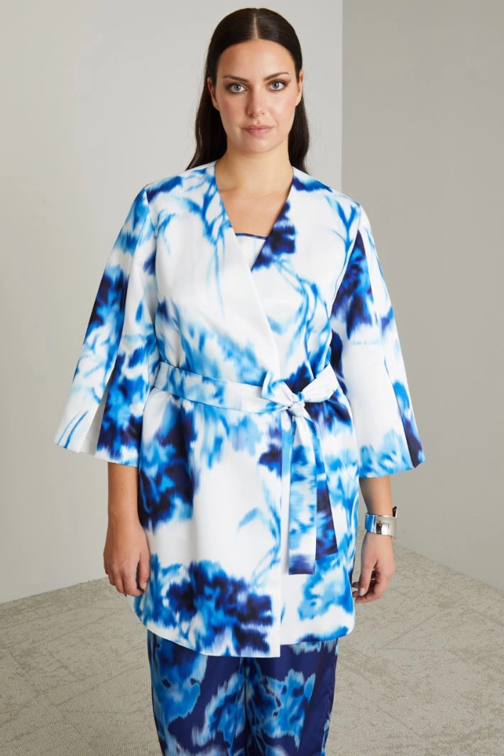 Loose fit robe coat in printed twill, featuring a V-neck, three-quarter sleeves with slits, a front fastening with belt loops and a matching belt. Lined