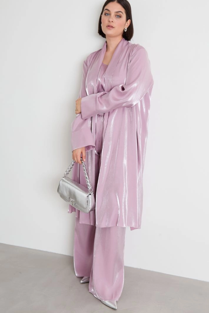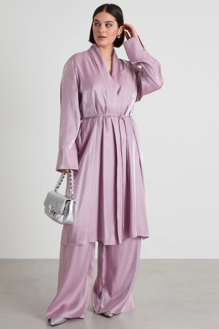 Loose-fit duster coat in lamé viscose blend canvas, with a shawl collar, long sleeves with cuffs and slit, and fastening with a matching belt.
