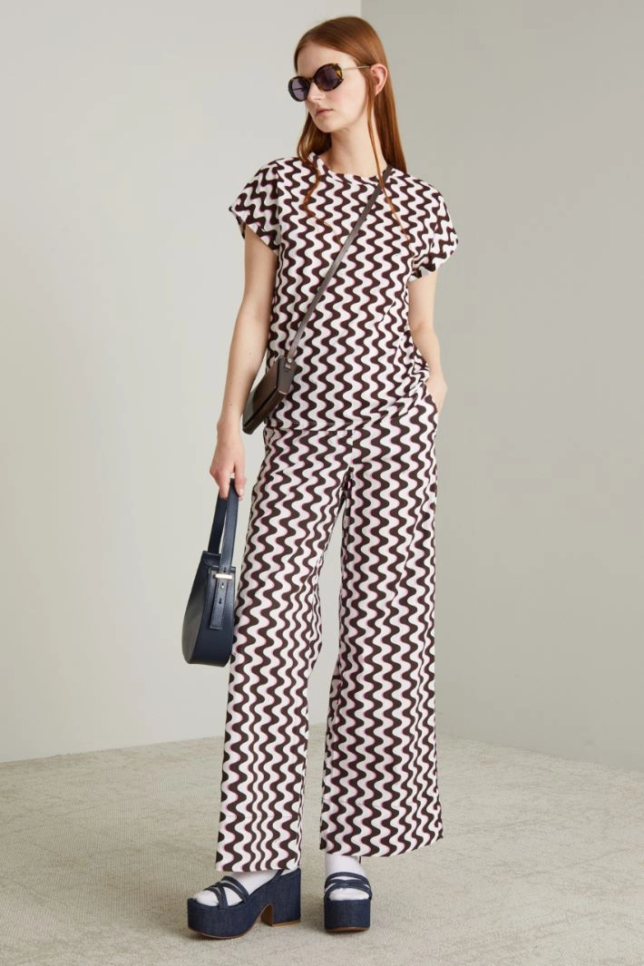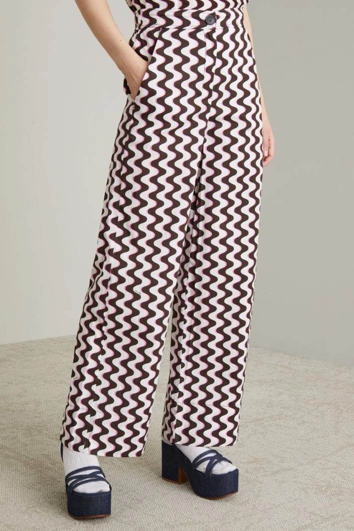 Patterned cotton poplin palazzo trousers with waistband and French pockets. Zip and button fastening.