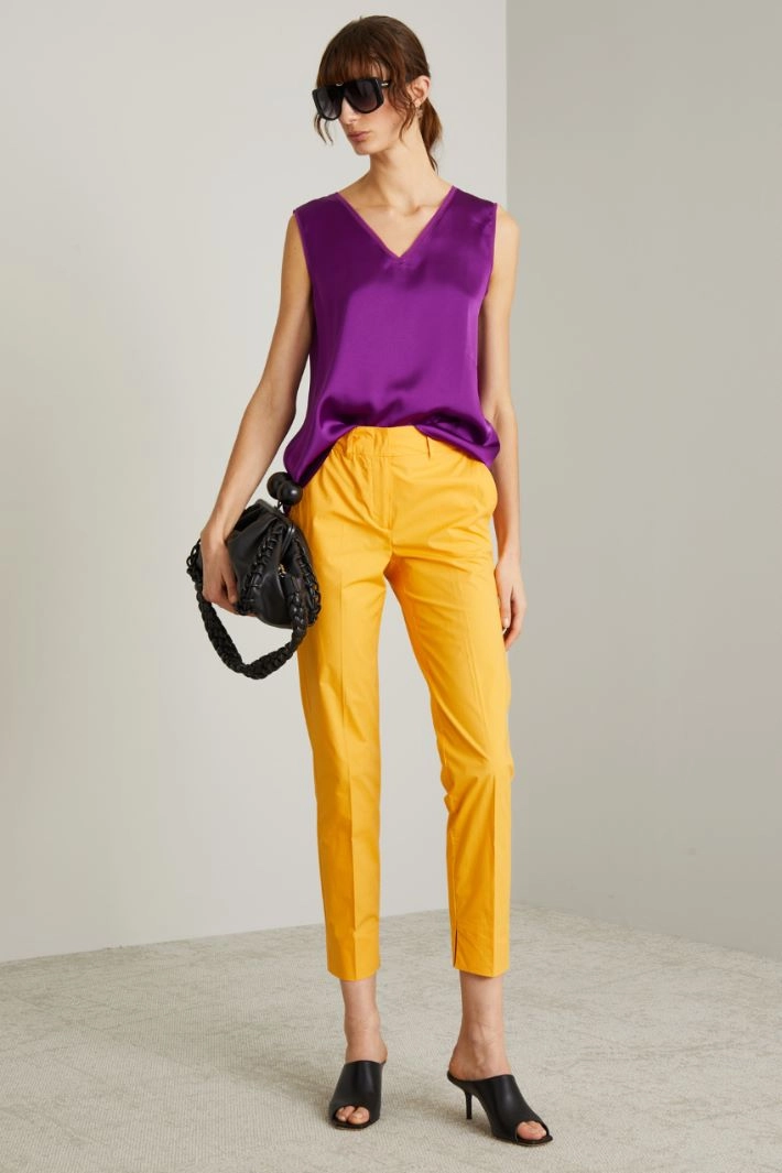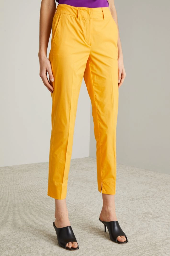 Cigarette trousers in stretch cotton poplin, with belt loops at the waist, side French pockets and welt pockets at the back, crease pressed lengthwise and hidden fastening with zip, button and hook.