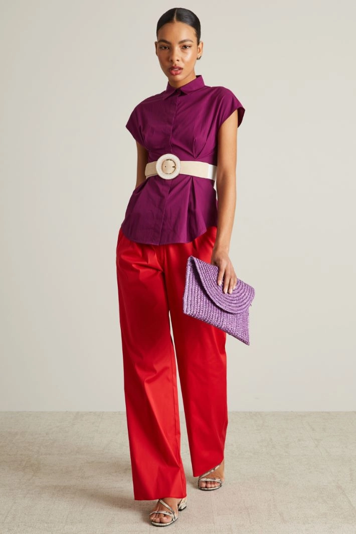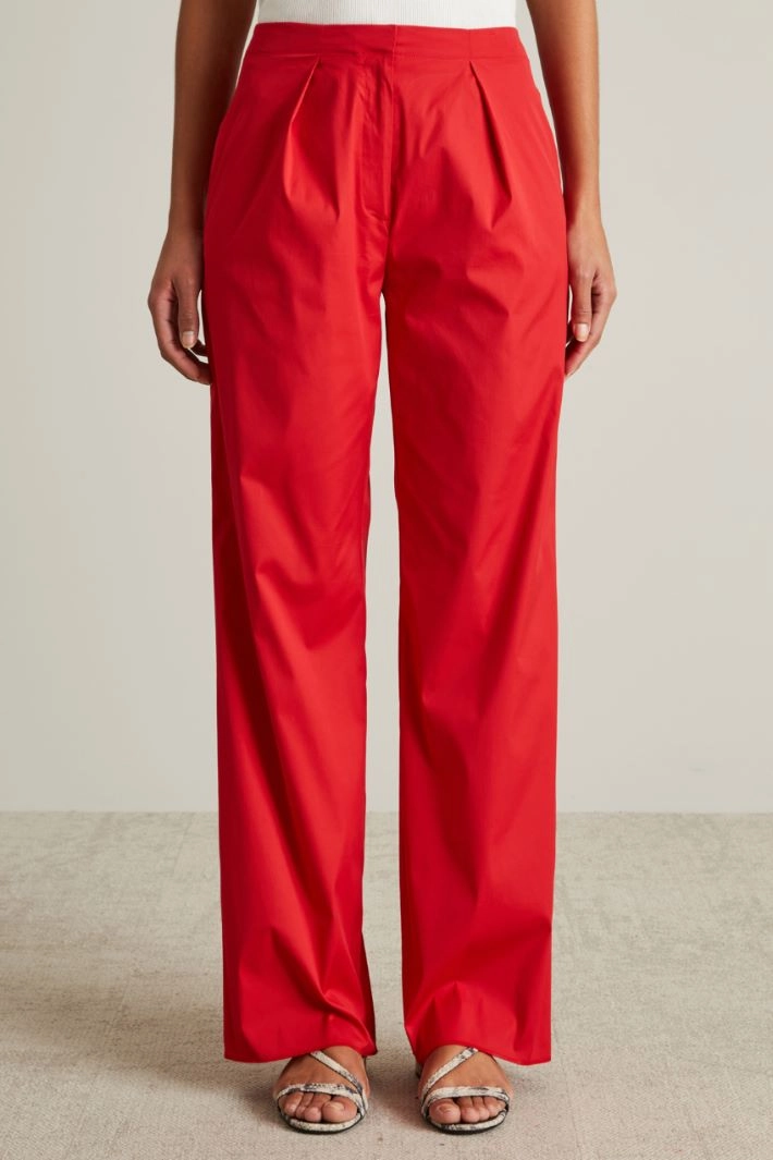 Straight-cut cotton poplin trousers with elastic waistband. French pockets in front, with flap in back. Hook and zip fastening.