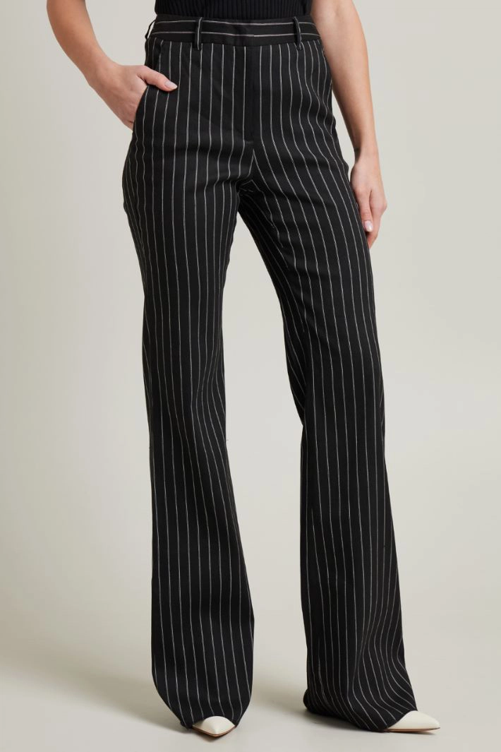 Loose, flared trousers in yarn-dyed, pinstriped linen blend canvas with French pockets at the front and welt pockets at the back, creases and fastening with a zip hidden by a button and hook.