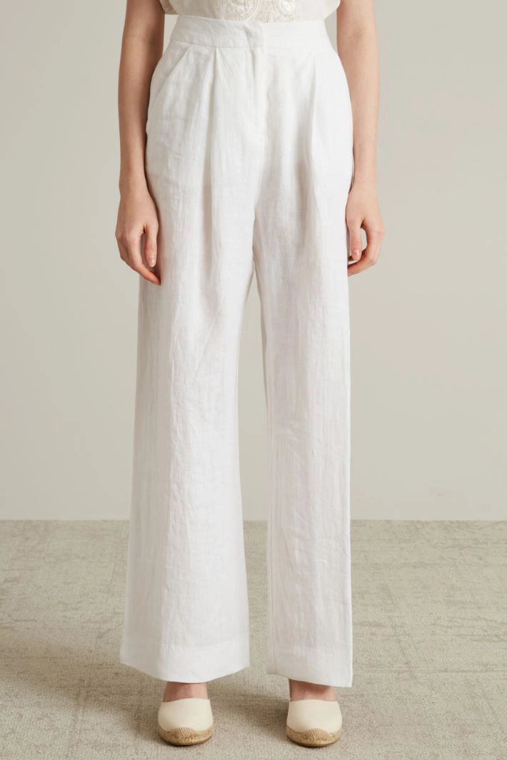 Straight-cut linen trousers with waistband. French pockets on the front, welt pockets on the back. Zip and hook fastening.