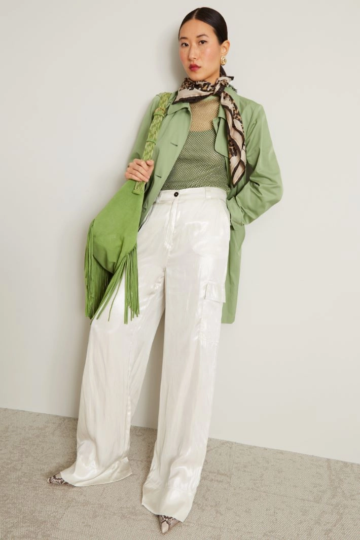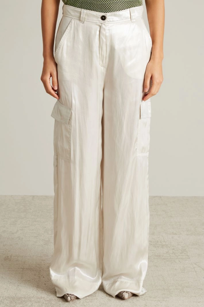 Loose-fit cargo trousers in coated fabric with a laminated finish, with belt loops at the waist, side French pockets, applied on the back and with flap along the leg, fastening with hidden zip and button.
