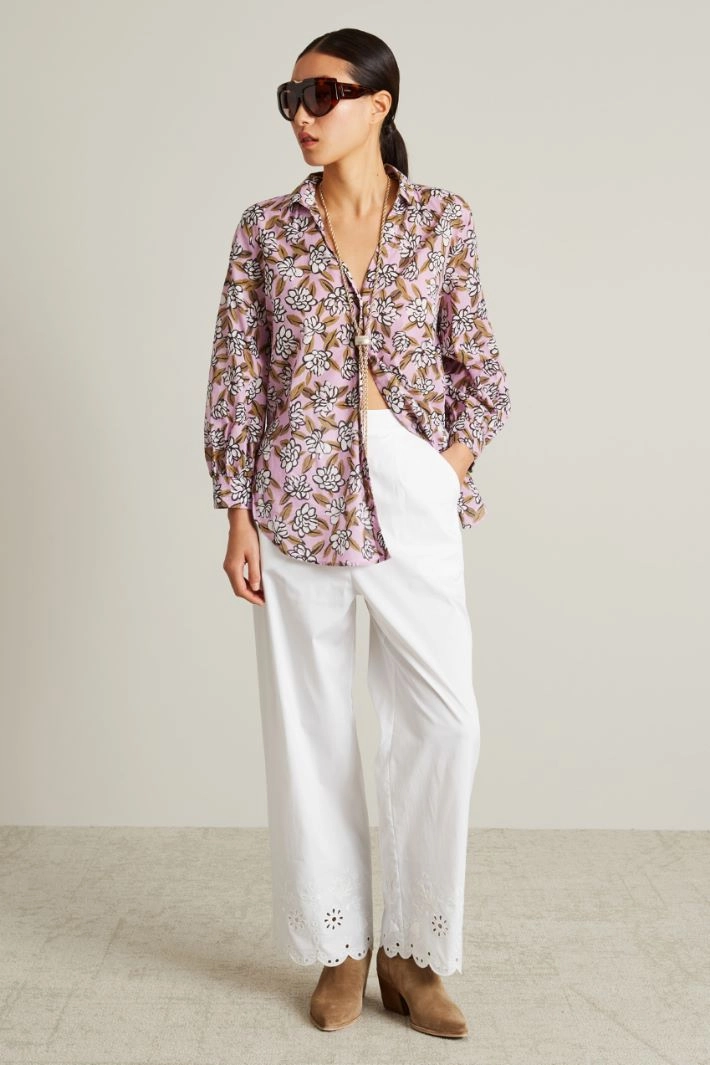 Straight and loose trousers in stretch cotton blend poplin, with pleats sewn at the waist, side French pockets and patch pockets on the back, broderie anglaise embroidery at the bottom. Invisible zip fastening on the side.