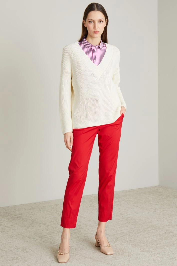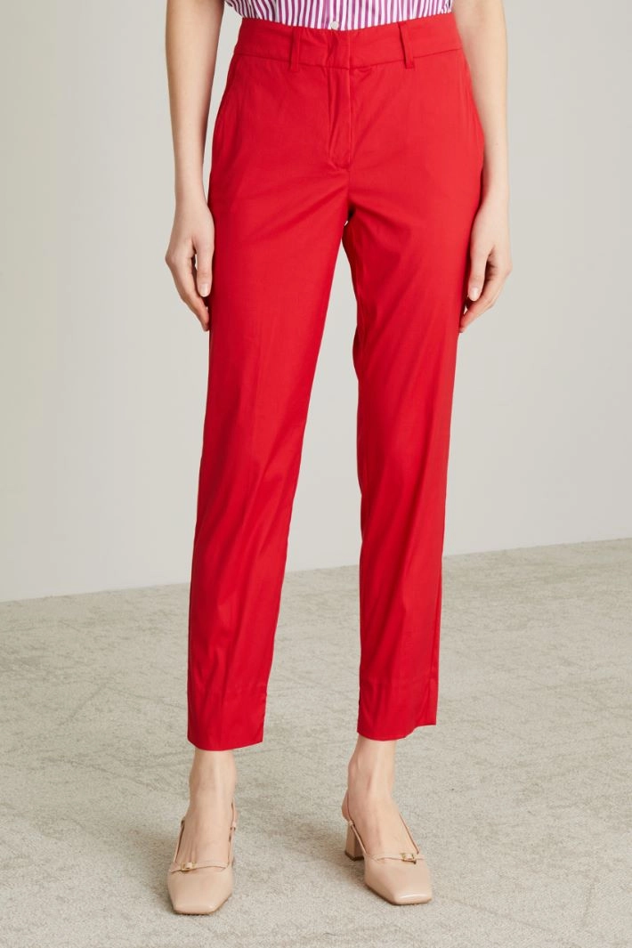 Cigarette trousers in stretch cotton satin, with French pockets on the front and welt pockets on the back. Fastening with zip, button and hook.