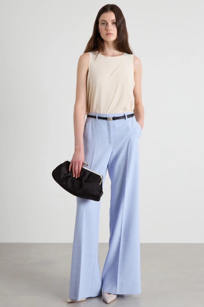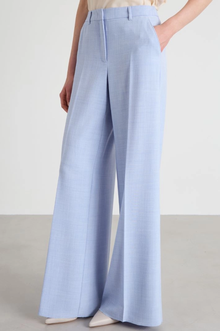 Straight-cut trousers in melange woven fabric with a sartorial finish, belt loops, French pockets on the front, welt pockets on the back, pressed crease along the length. Hidden fastening with zip, button and hook.