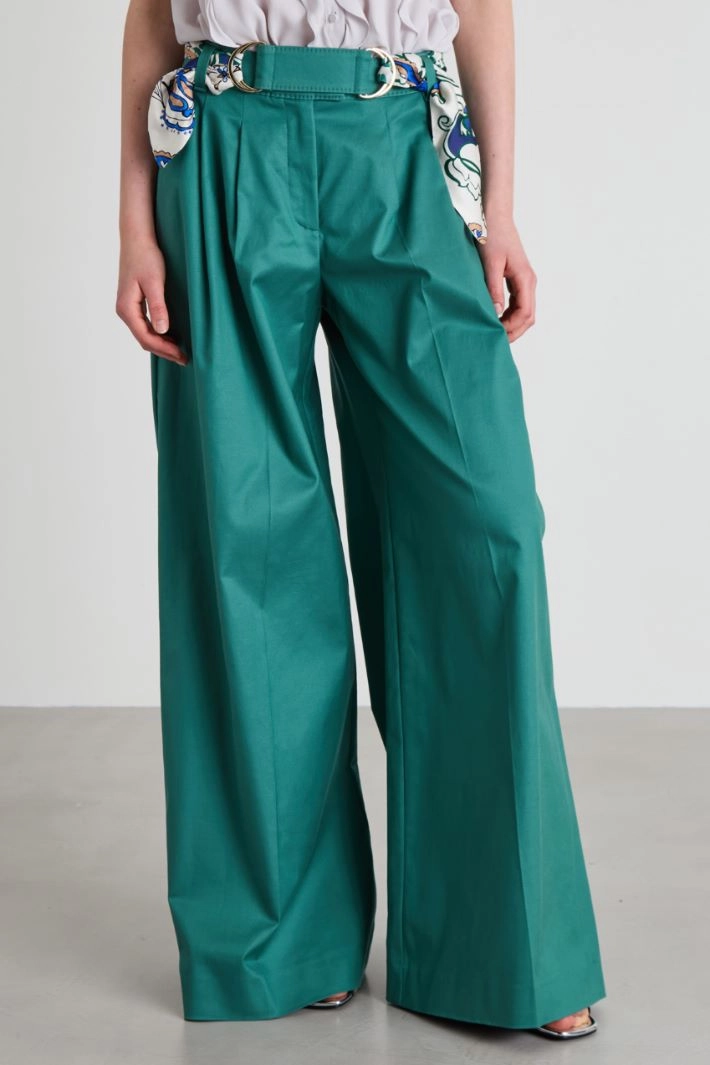 Wide-leg trousers in cotton-blend twill, with belt loops, pleats, French pockets in front and single welt pocket in back. Hidden fastening with zip, button and hook.