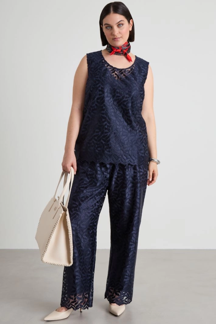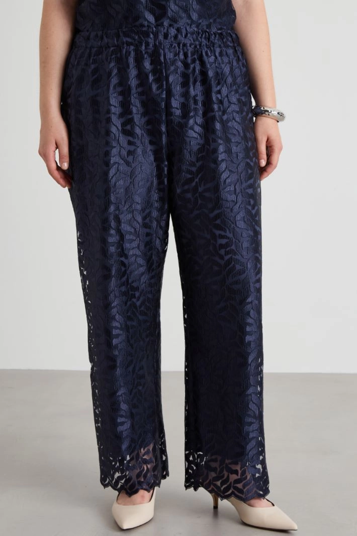 Straight-cut trousers in embroidered tulle, with elastic waistband and scalloped hem. Lined.