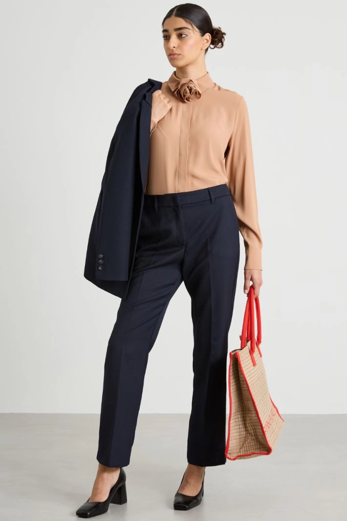 Straight-fit trousers in wool blend grisaille, with belt loops, French pockets in front, welt pockets in back and crease pressed lengthwise. Concealed fastening with zip, button and hook.