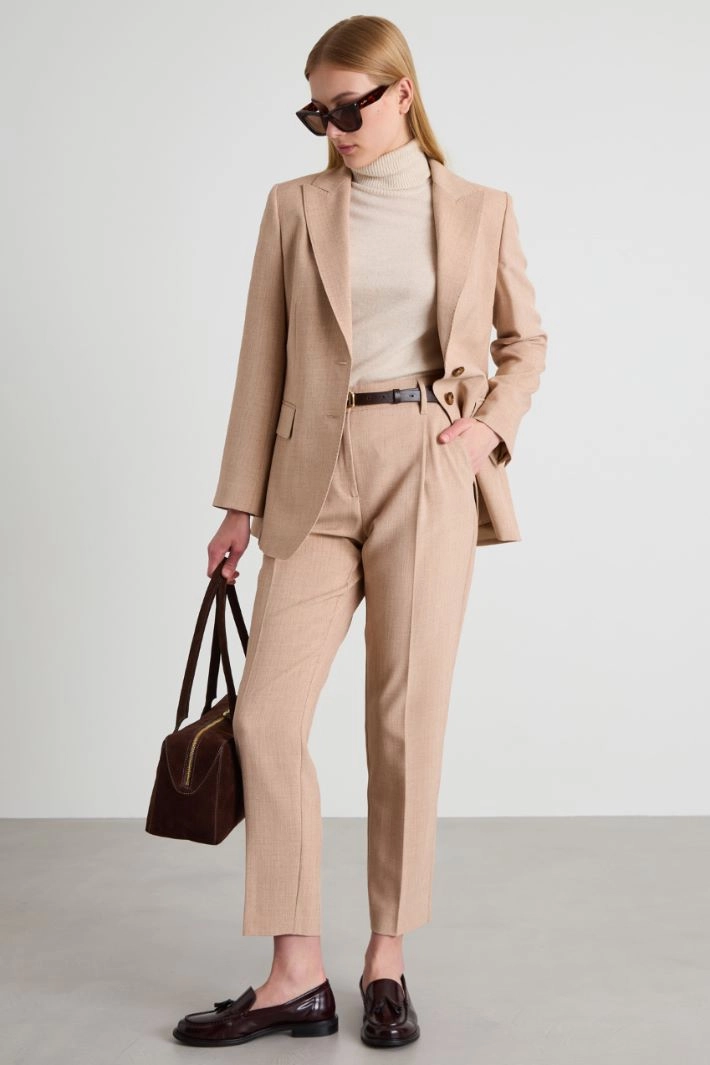 Cigarette trousers in melange woven fabric with topstitched finish, belt loops, elasticated waistband insert on the back, pleats, French pockets on the front, welt pockets on the back and crease ironed along the length. Hidden fastening with zip, button and hook.