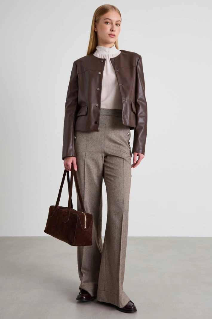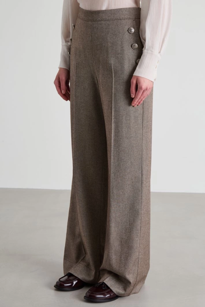 Straight-cut trousers in cotton and wool blend twill fabric, with French pockets and a metal button motif on the front, welt pockets on the back and a crease ironed along the length. Invisible zip fastening on the side.