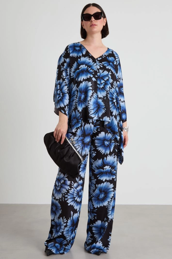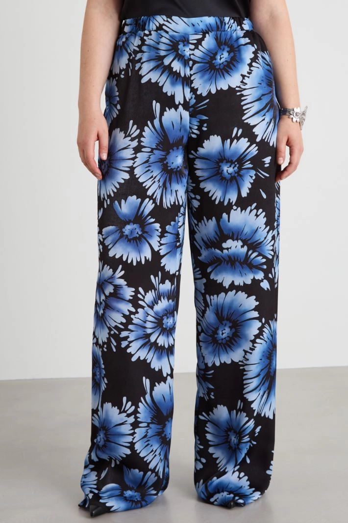 Straight-cut trousers in printed satin, with elasticated waistband and inset pockets.