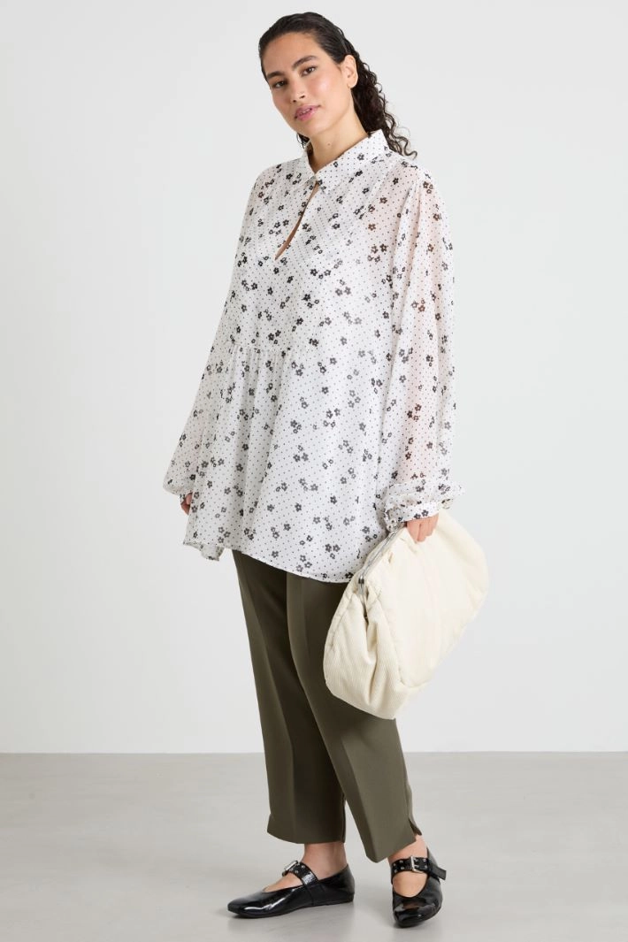 Cigarette-fit trousers in crepe envers satin, with elastic waistband insert on the back, pressed crease lengthwise and side slits at the hem. Zip and button fastening.
