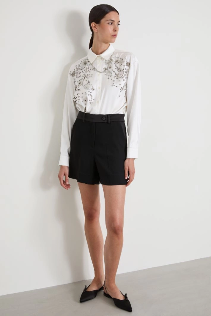 Regular-fit shorts in crepe envers satin, with belt loops, elasticated waistband insert on the back, French pockets on the front, welt pockets on the back and crease pressed lengthwise. Zip and button fastening.