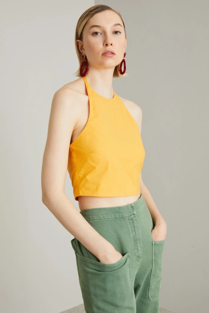 Slim-fit cropped top in stretch cotton poplin, with a halterneck finished with a tie at the neck and side zip fastening.