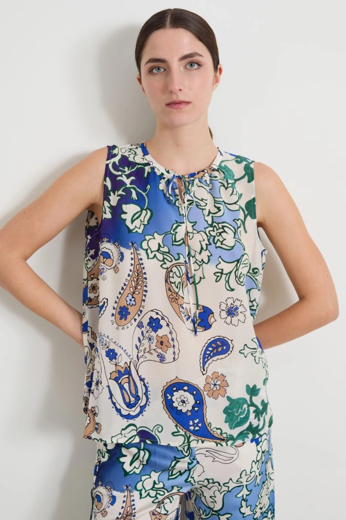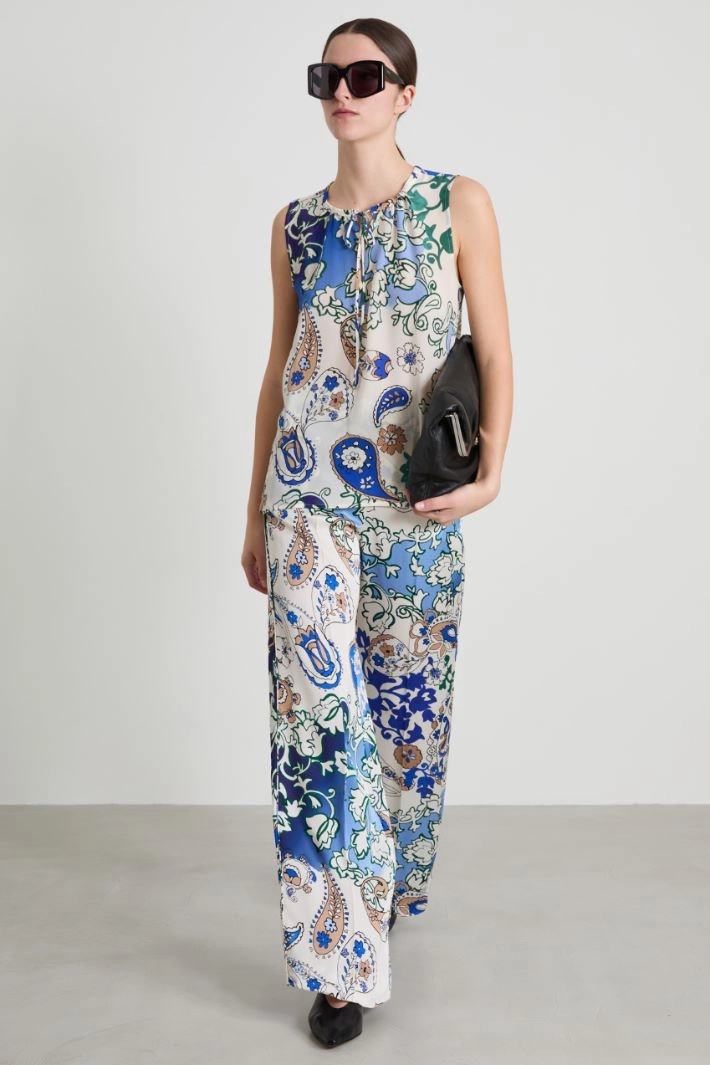Slightly flared top in pure silk crepe de chine, with V-neck and laces. Asymmetrical hem.
