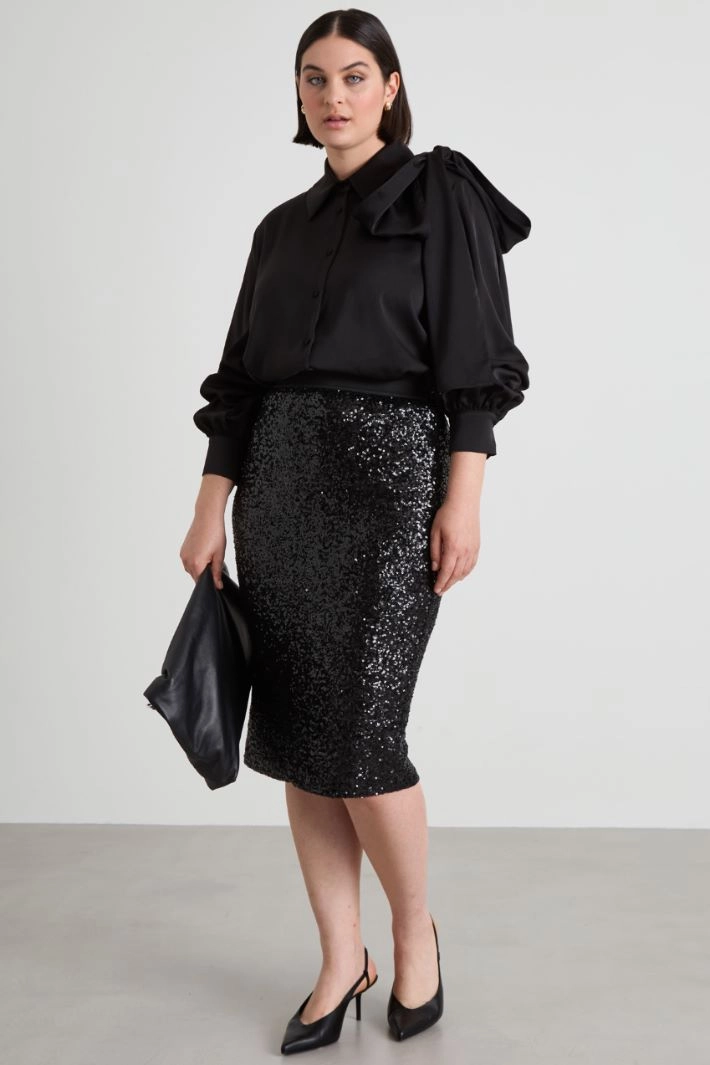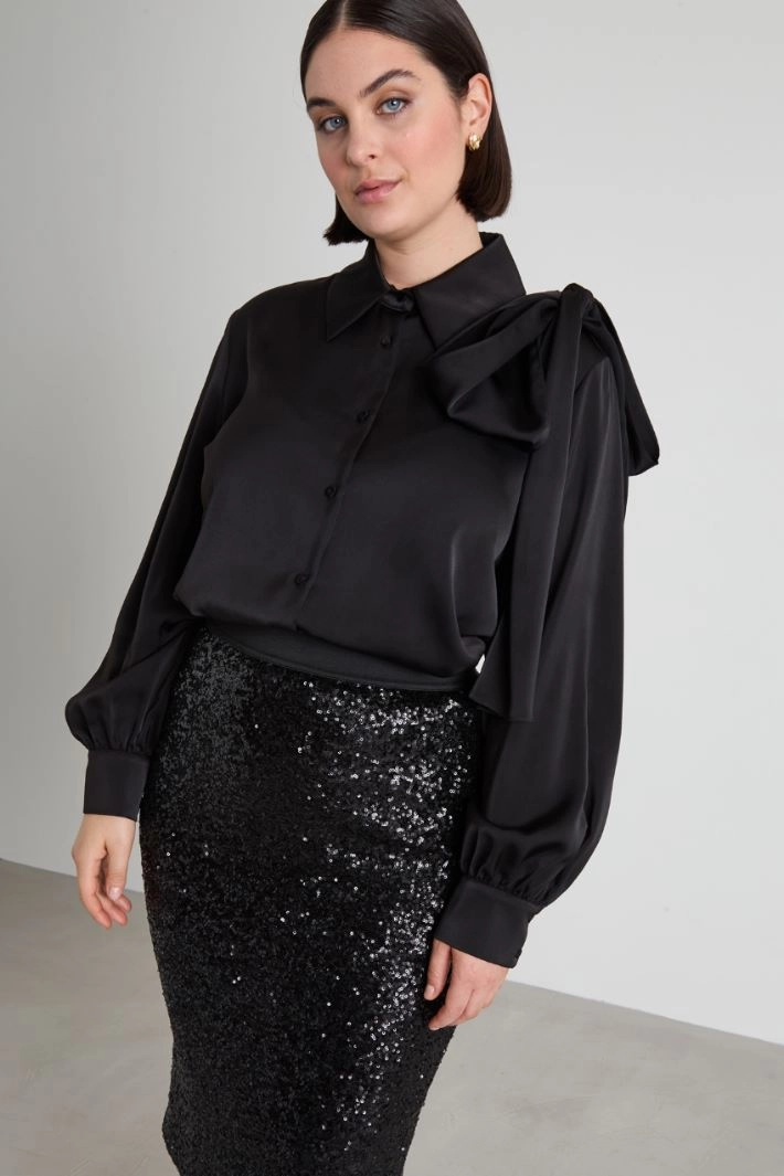 Flowing satin blouse with classic collar, long sleeves with cuff and buttons and removable sash to tie on one shoulder. Visible fastening with covered buttons.