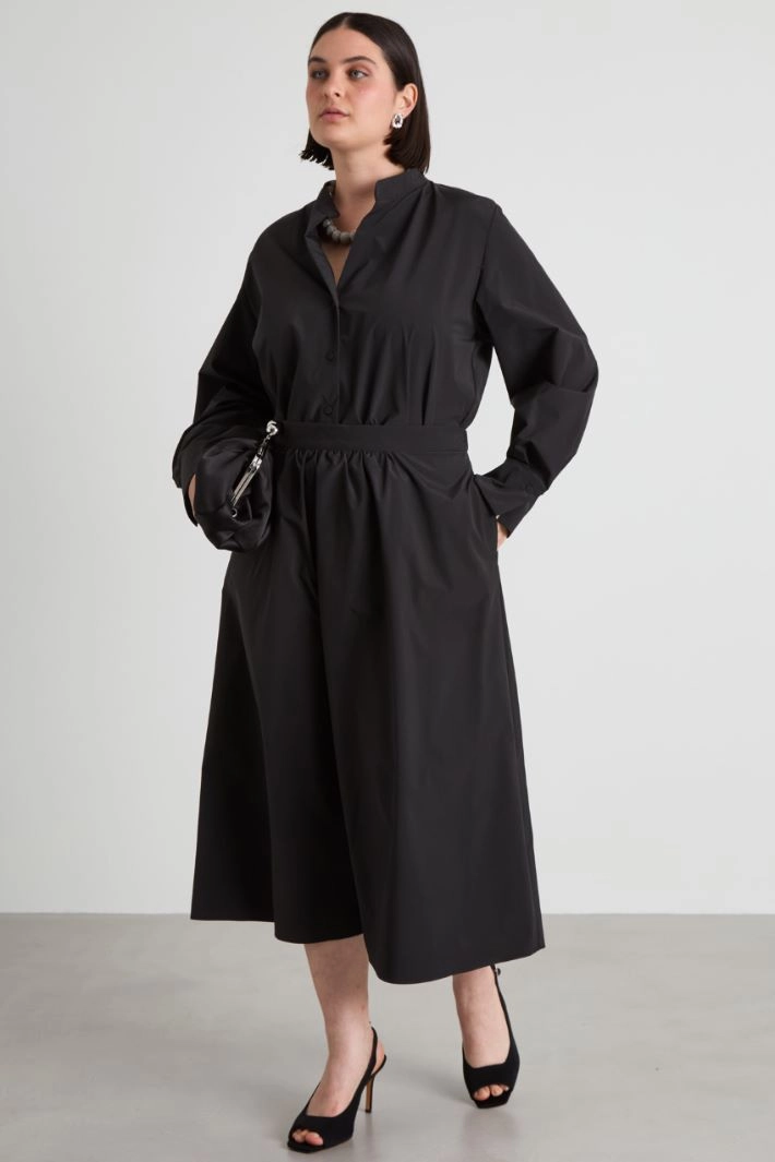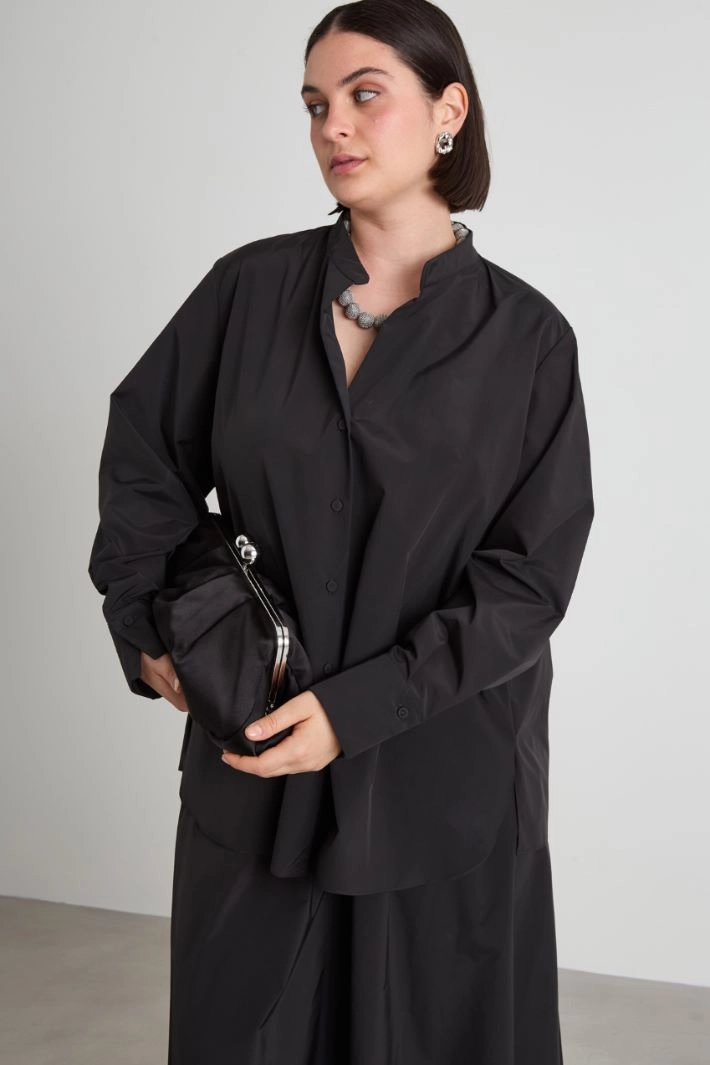 Straight-cut taffeta shirt with stand-up collar, long sleeves with cuff and button, yoke with box pleat on the back and side slits at the hem. Fastening with covered buttons.