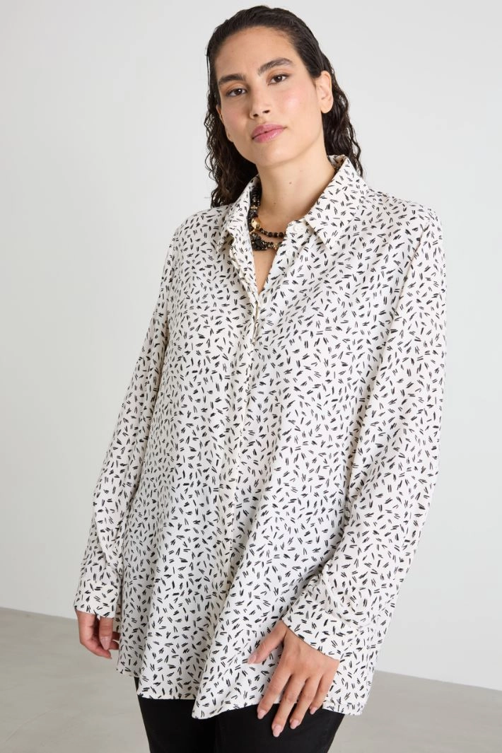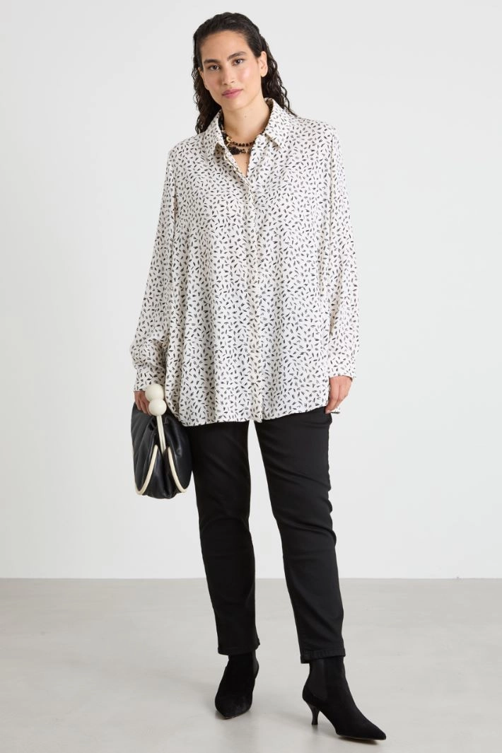 Flared shirt in printed flowing cady, with classic collar, long sleeves with cuff and button. Hidden button fastening.