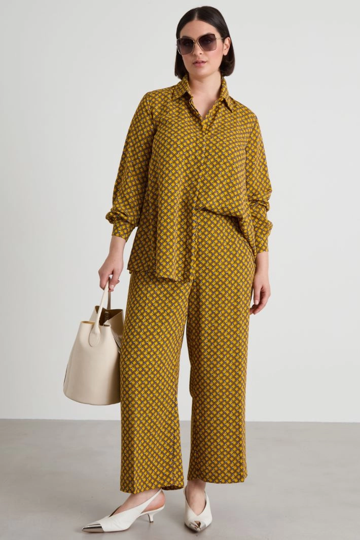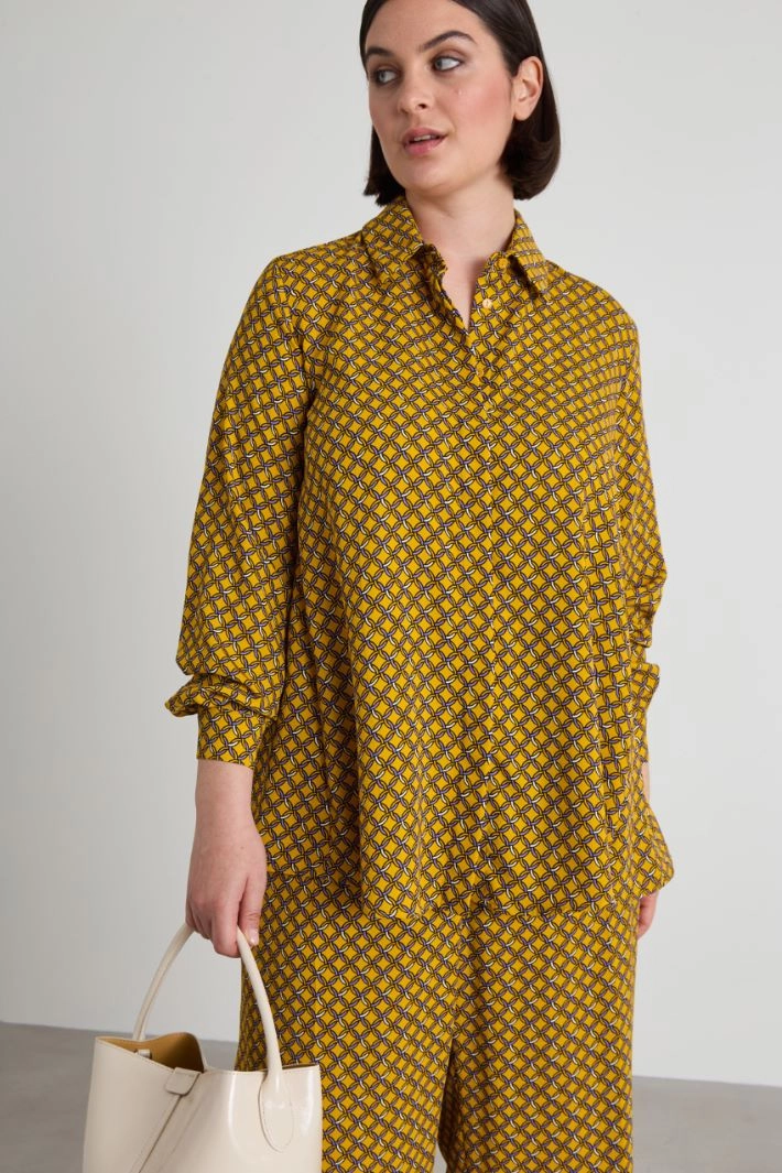 Flared shirt in printed flowing cady, with classic collar, long sleeves with cuff and button. Hidden button fastening.