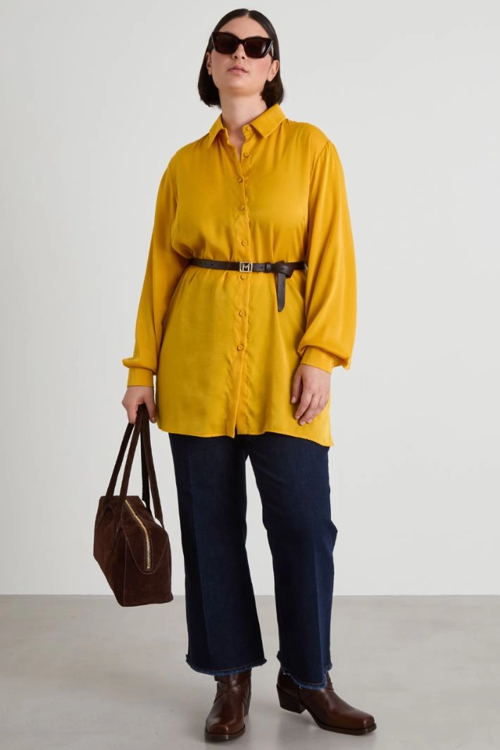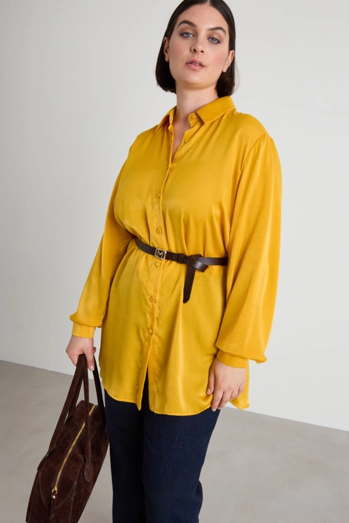 Straight-cut satin shirt with classic collar, long sleeves with cuff and button. Fastening with tone-on-tone buttons.