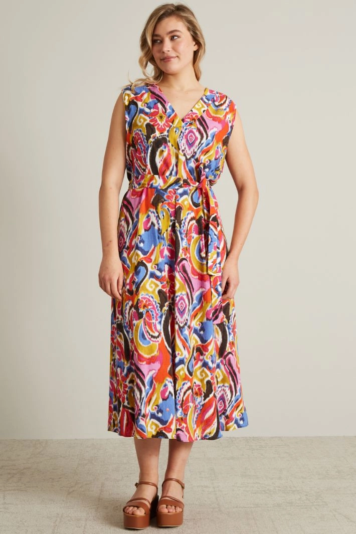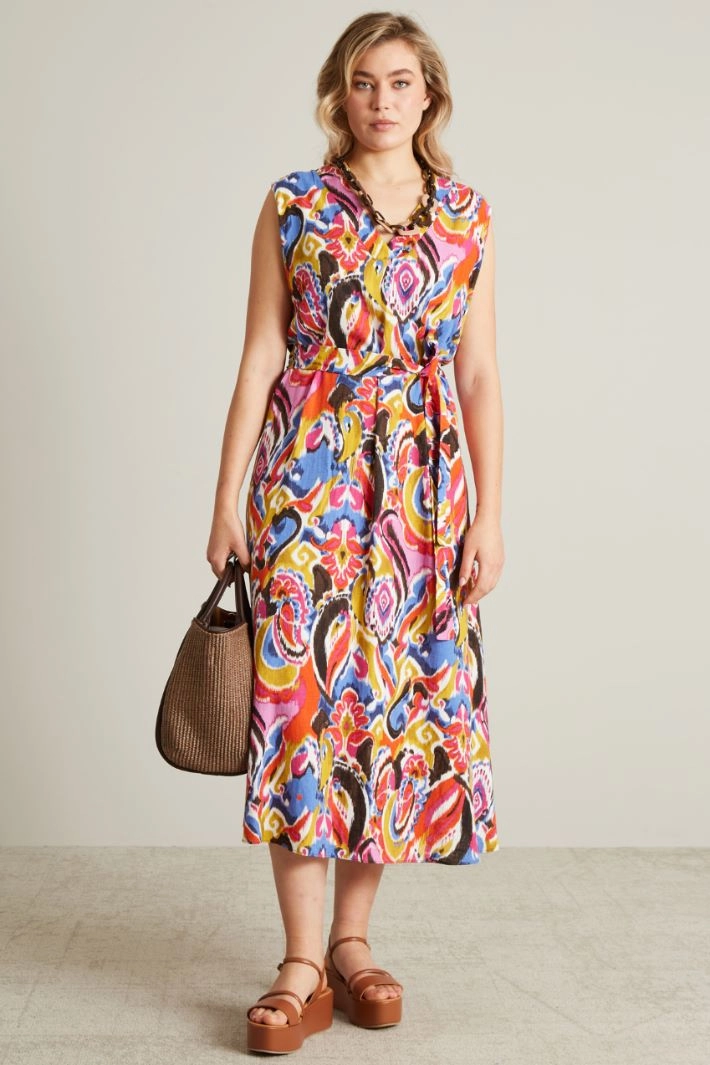 Flared viscose and linen dress with a V-neck and short sleeves. Side slits and matching belt.