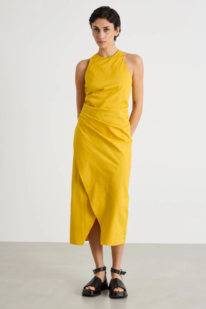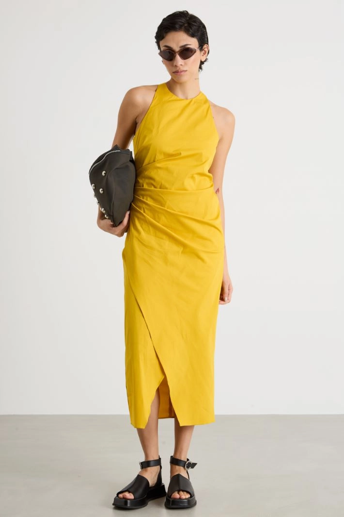 Fitted midi dress in cotton satin, with a halter neck, draped detailing at the side and a diagonal front slit. Unlined. Zip fastening at the back.