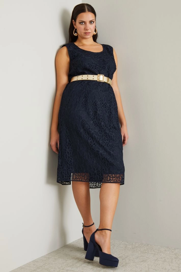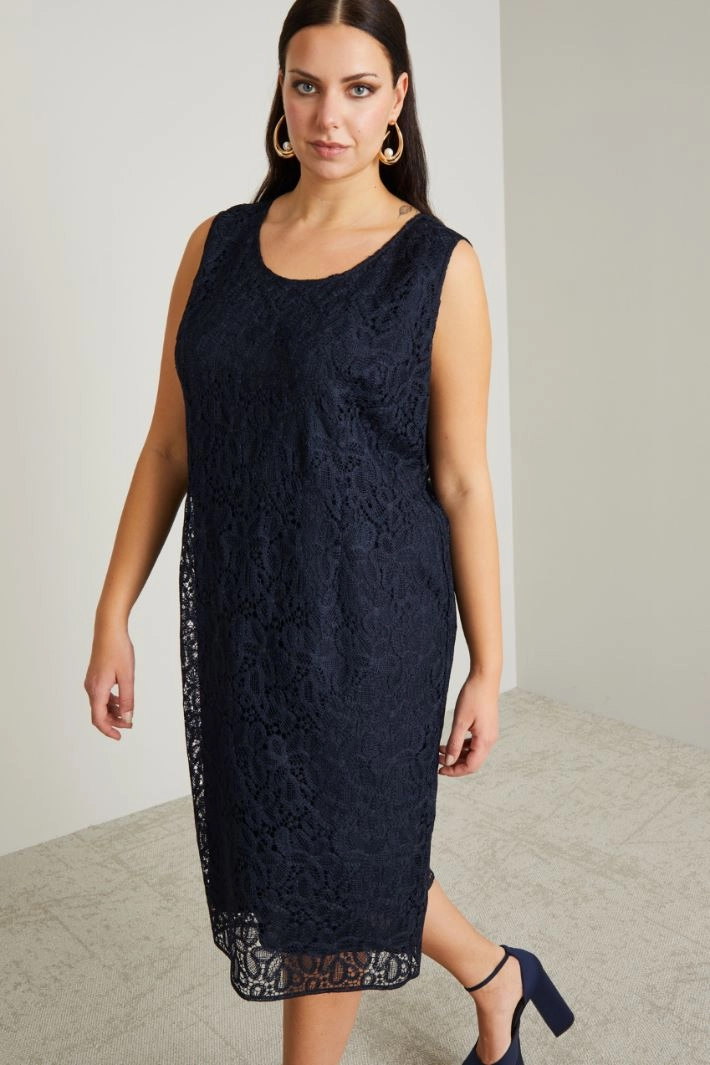 Straight sleeveless lace dress, slightly fitted with a round neckline, wide shoulder straps and invisible zip fastening on the back.