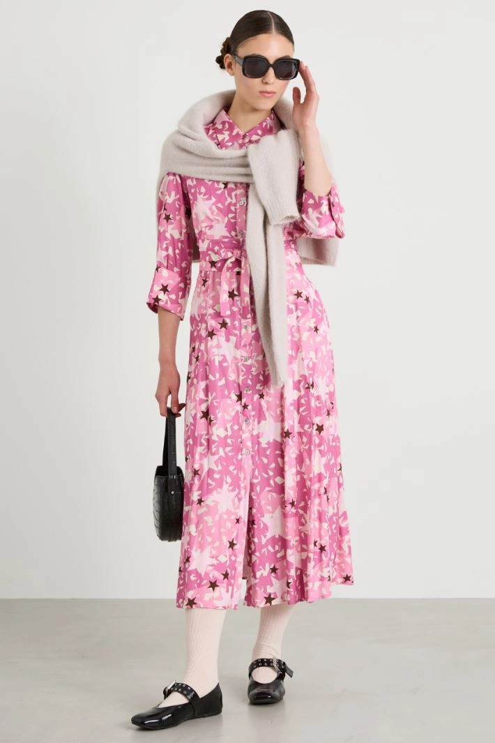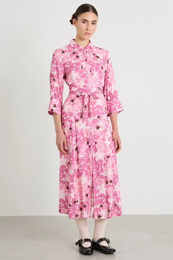Flowing shirt dress in all-over printed twill, with classic collar, three-quarter sleeves with cuff and button, patch pockets on the chest, inset side pockets and yoke on the back. Visible fastening with buttons along the entire length. Matching sash.