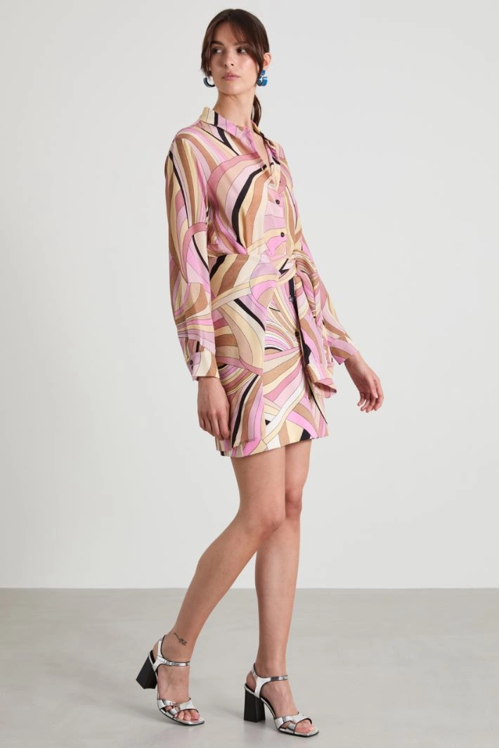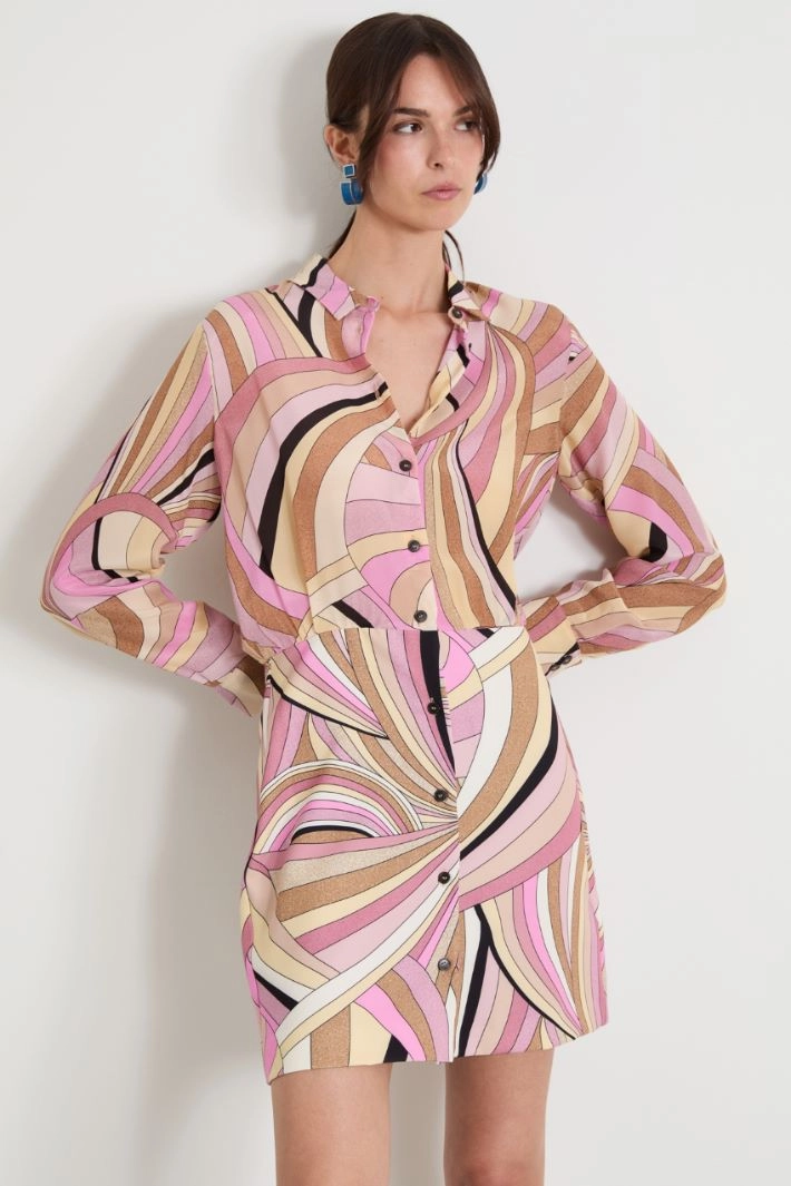 Slightly fitted shirt dress in pure silk crepe de chine for the shirt and flowing cady for the skirt, with a shirt collar and long sleeves with cuffs and buttons. Button fastening.