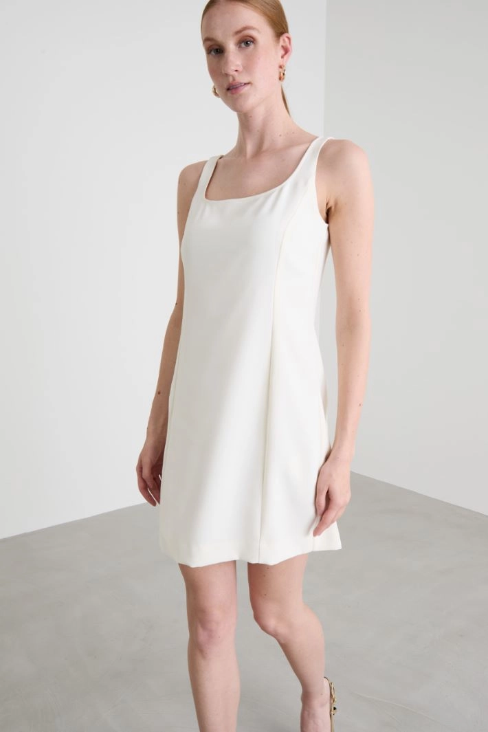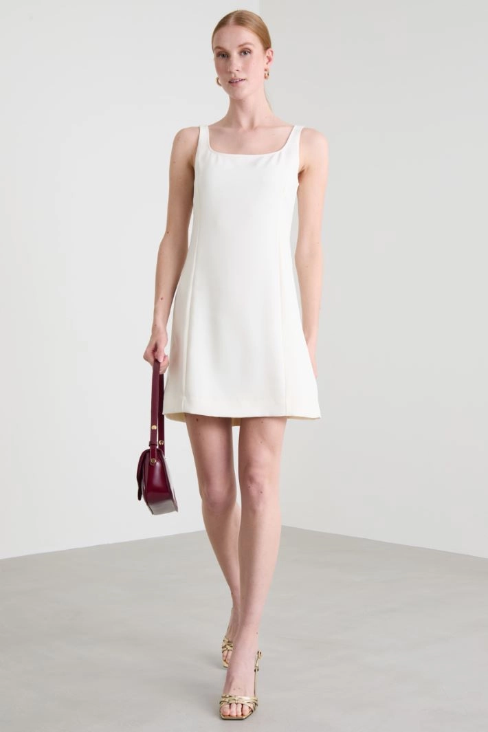 Semi-fitted dress in crepe envers satin, with rounded neckline, thin shoulder straps and invisible zip fastening on the back. Lined.