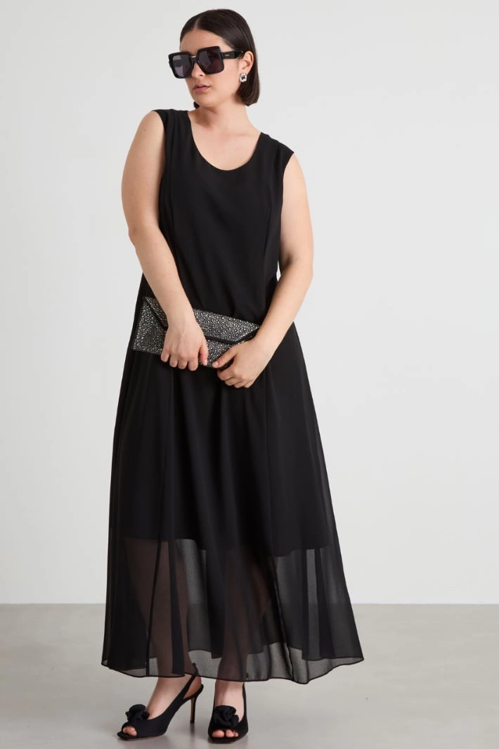 Georgette dress with rounded neckline and fastening with hook and invisible zip on the back. Lined.