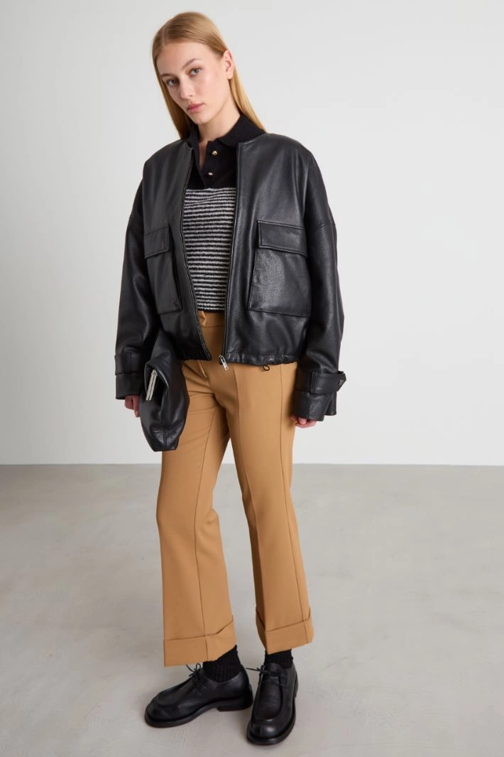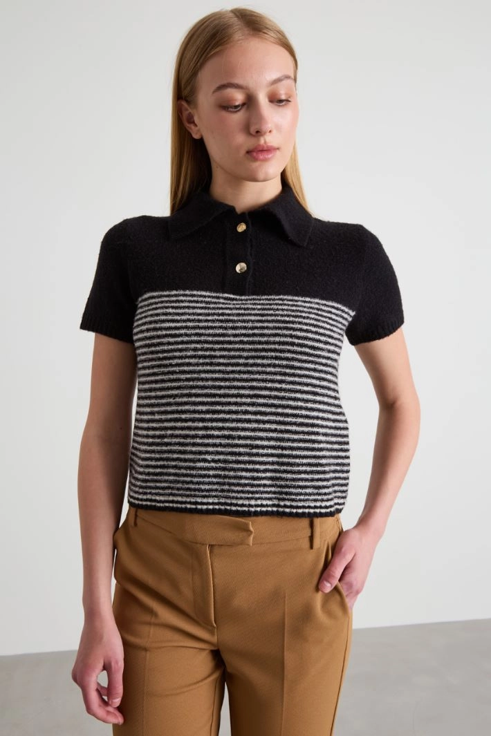 Cropped, straight-cut polo-style sweater made from yarn-dyed wool-blend bouclé yarn, with a classic collar, V-neck opening with buttons and short sleeves.