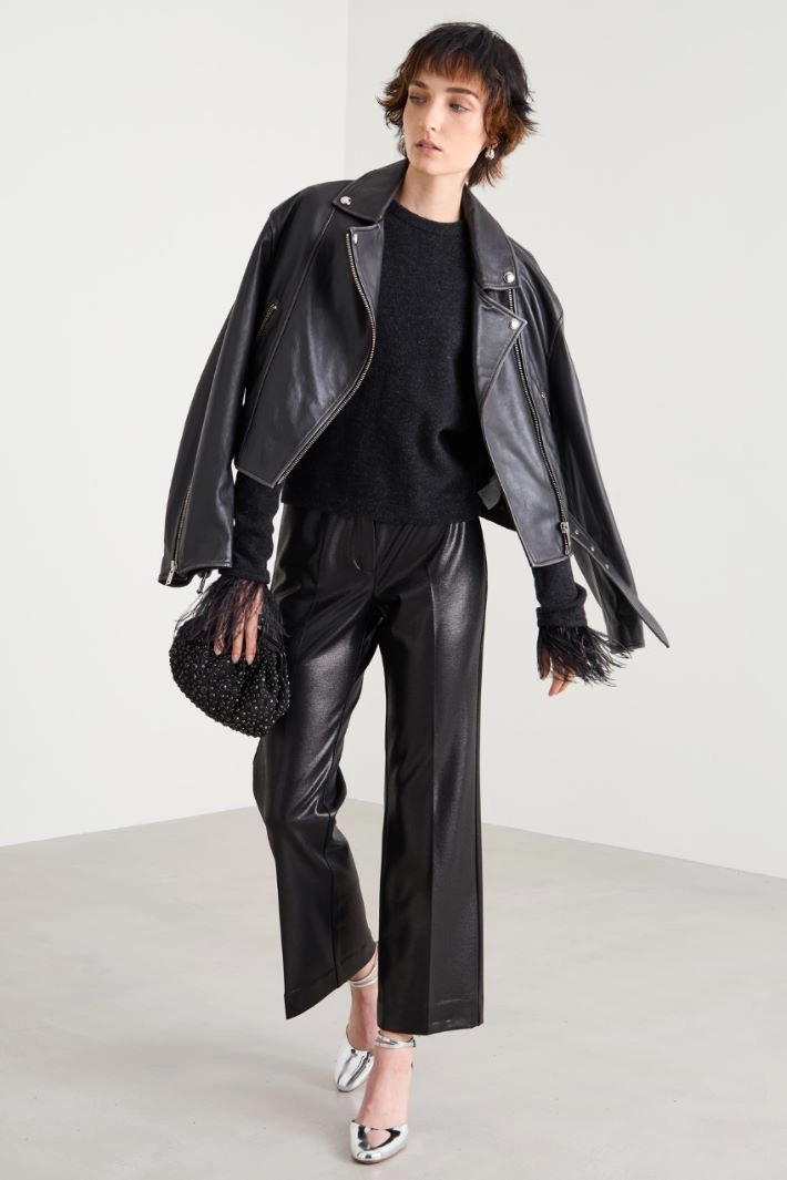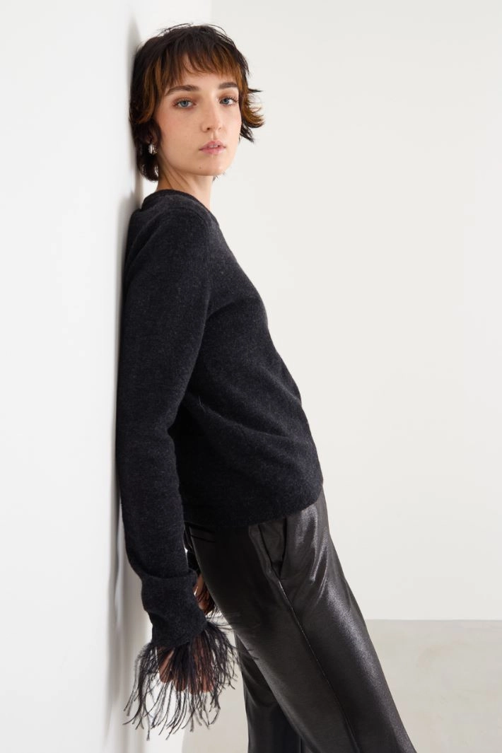Straight-cut sweater in stretch wool blend, round neckline on the front and teardrop cut-out on the back with button and long sleeves. Removable ostrich feathers on the cuffs