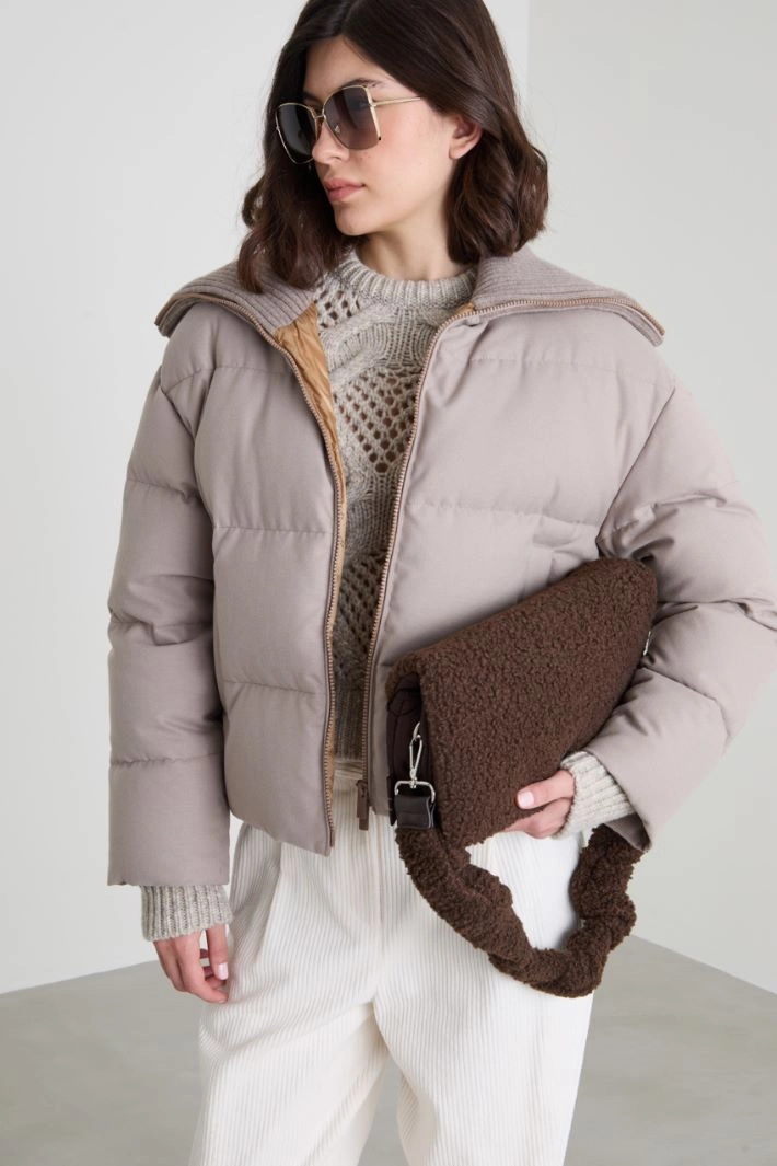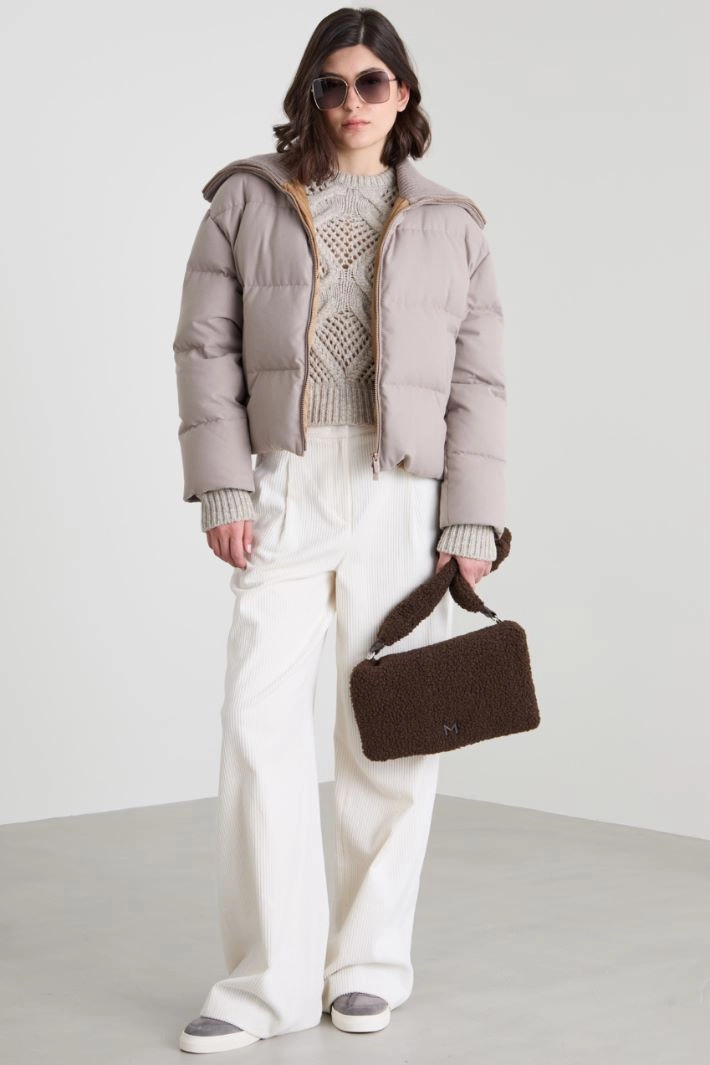 Fabric 72% polyester, 22% viscose, 6% elastane; lining 100% polyamide; with quilting in down; with knitted details 100% virgin wool.