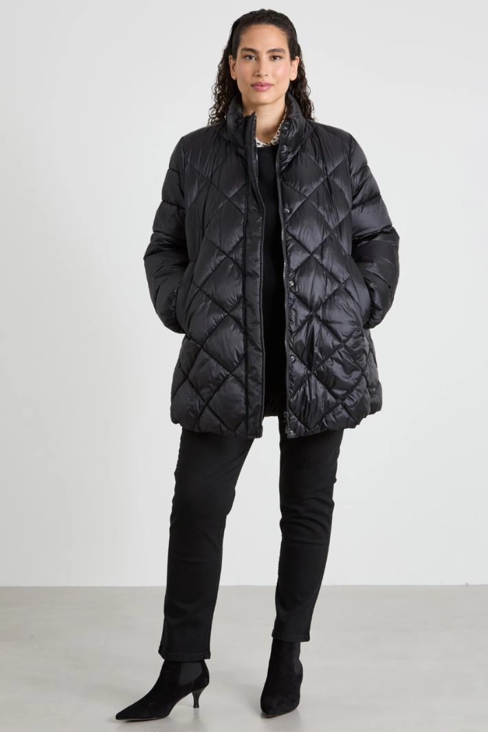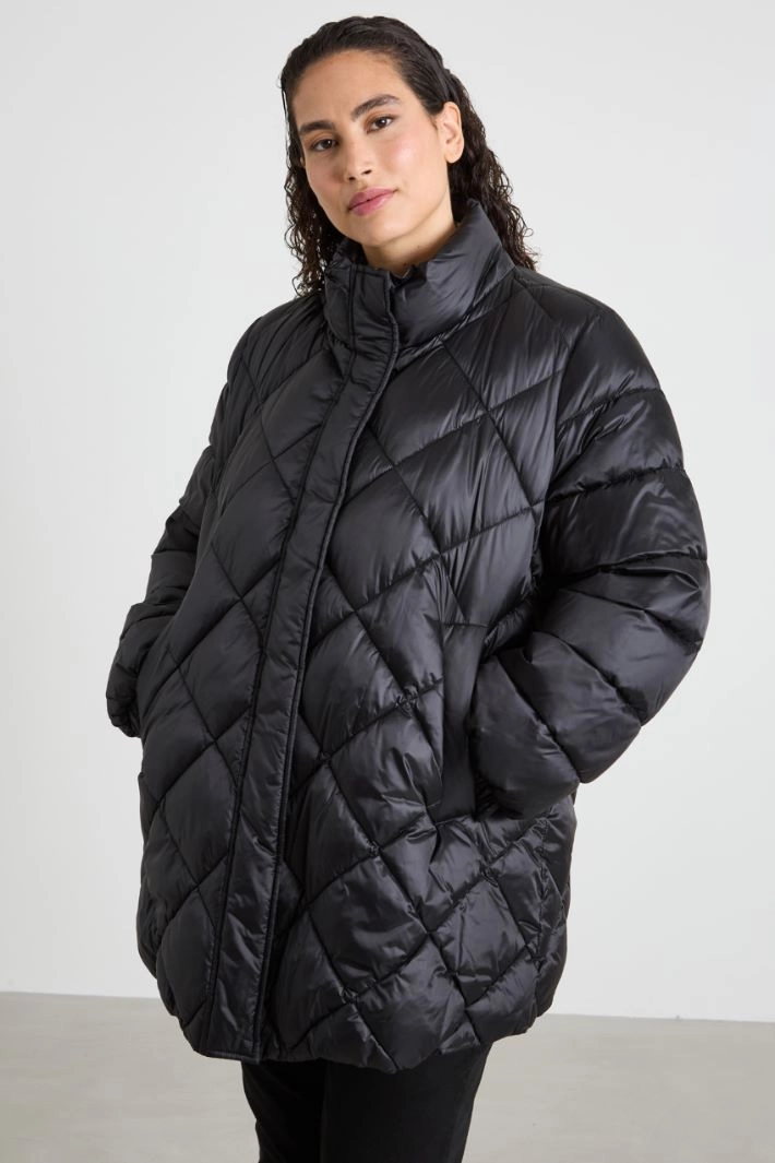 Flared puffer in quilted technical satin, with high collar, hidden hood, long sleeves with elastic cuff and side welt pockets. Hidden fastening with double slider zip and buttons.