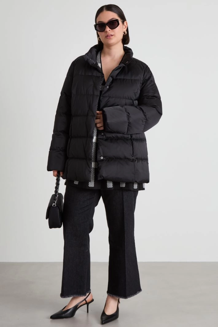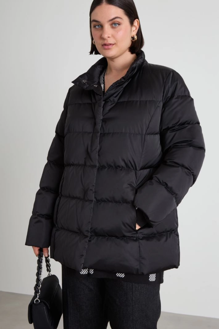 Straight-fit down jacket in technical satin, with high collar, long sleeves and pockets in the seams with zip. Hidden fastening with press studs.