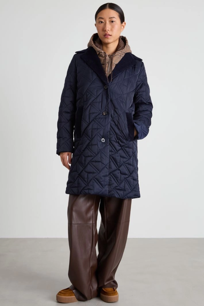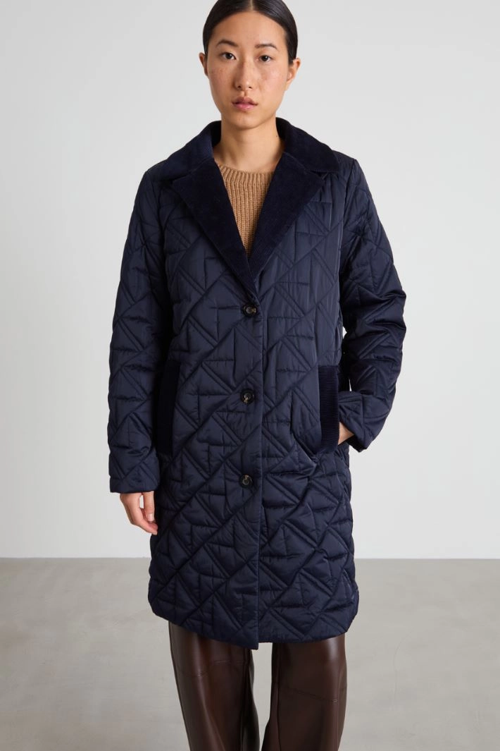 Long straight-fit padded coat in quilted technical satin, with corduroy lapel collar, long sleeves and side welt pockets. Central slit on the back and single-breasted fastening with buttons.