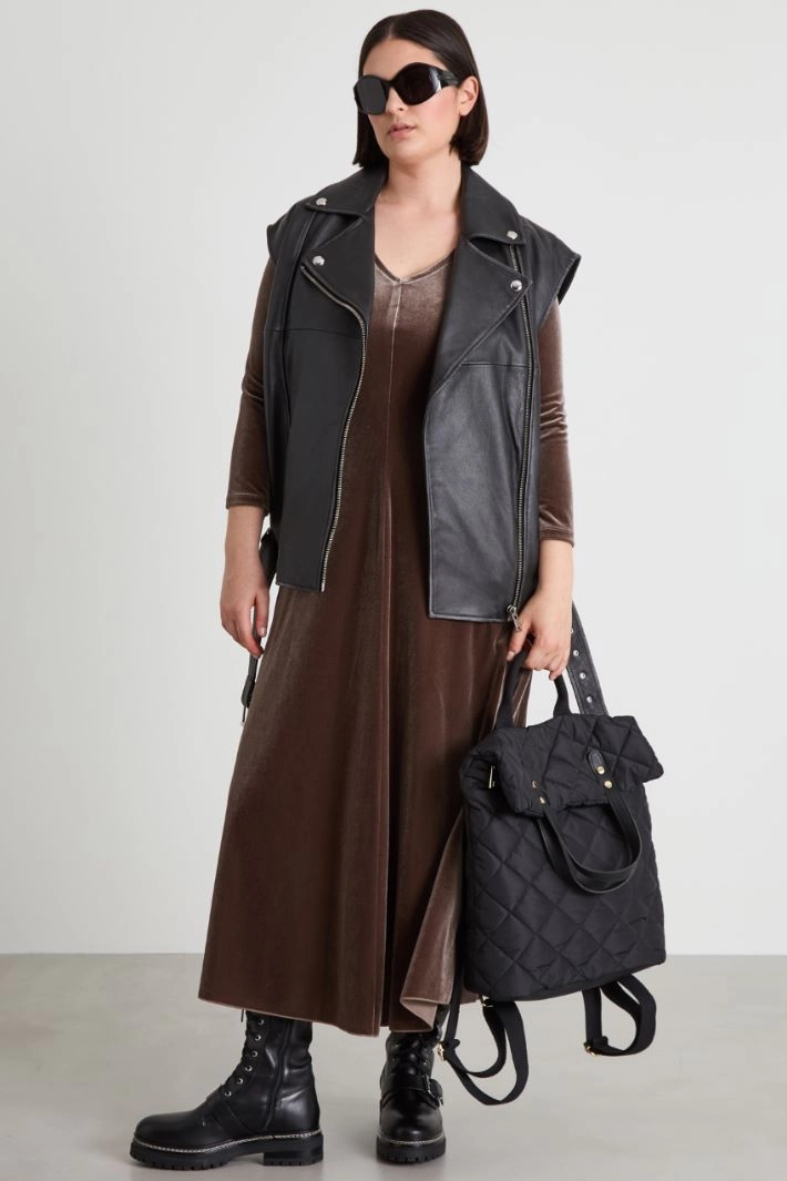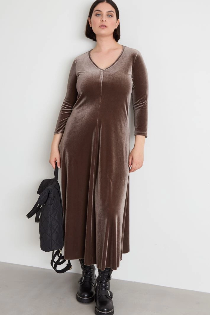 Flared dress in stretch chenille, with V-neck and three-quarter sleeves.