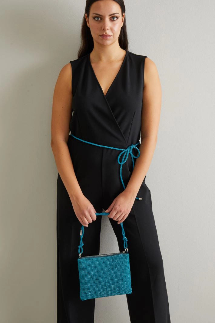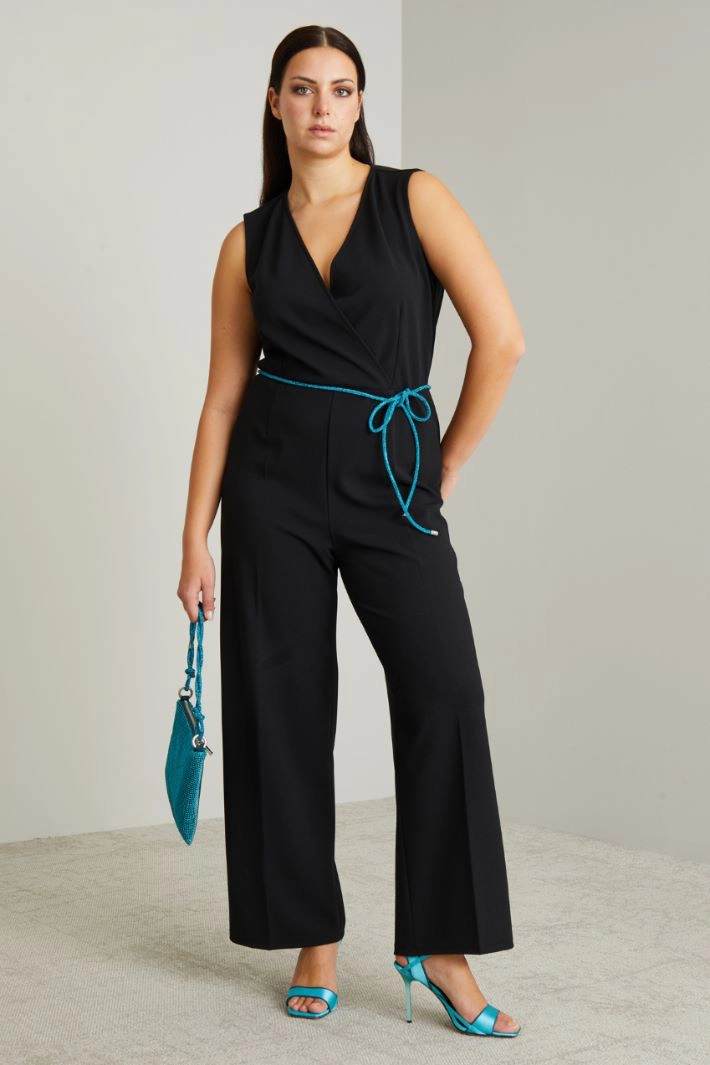 Sleeveless jumpsuit with a loose fit in compact jersey, featuring a V-neck, a horizontal seam at the waist, palazzo trousers with a pressed crease and invisible zip fastening at the back.